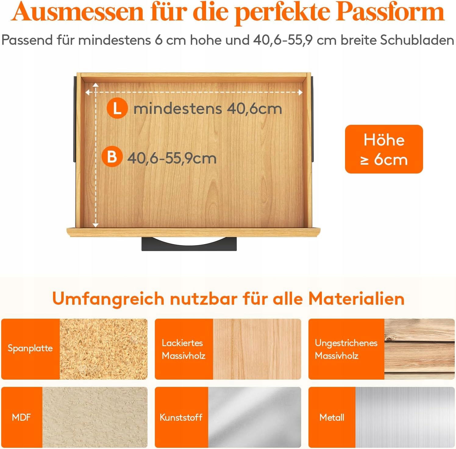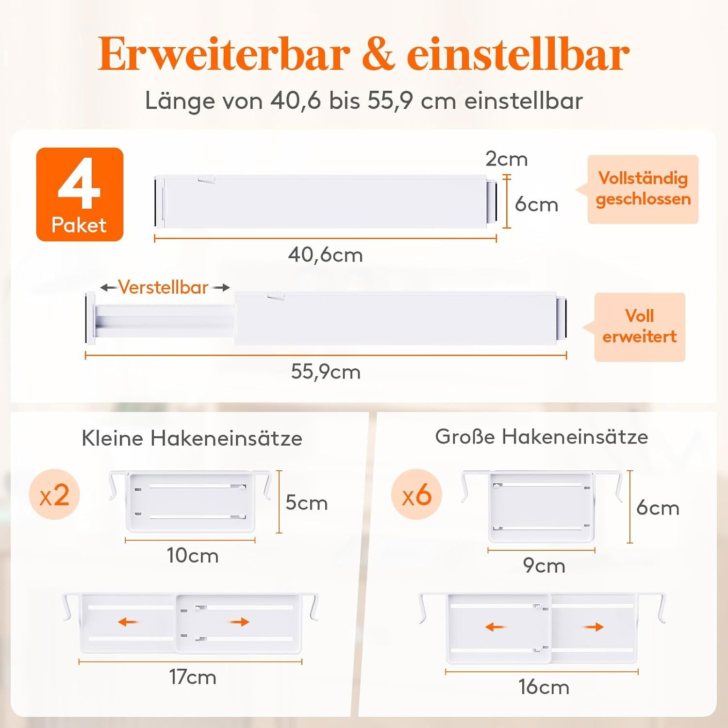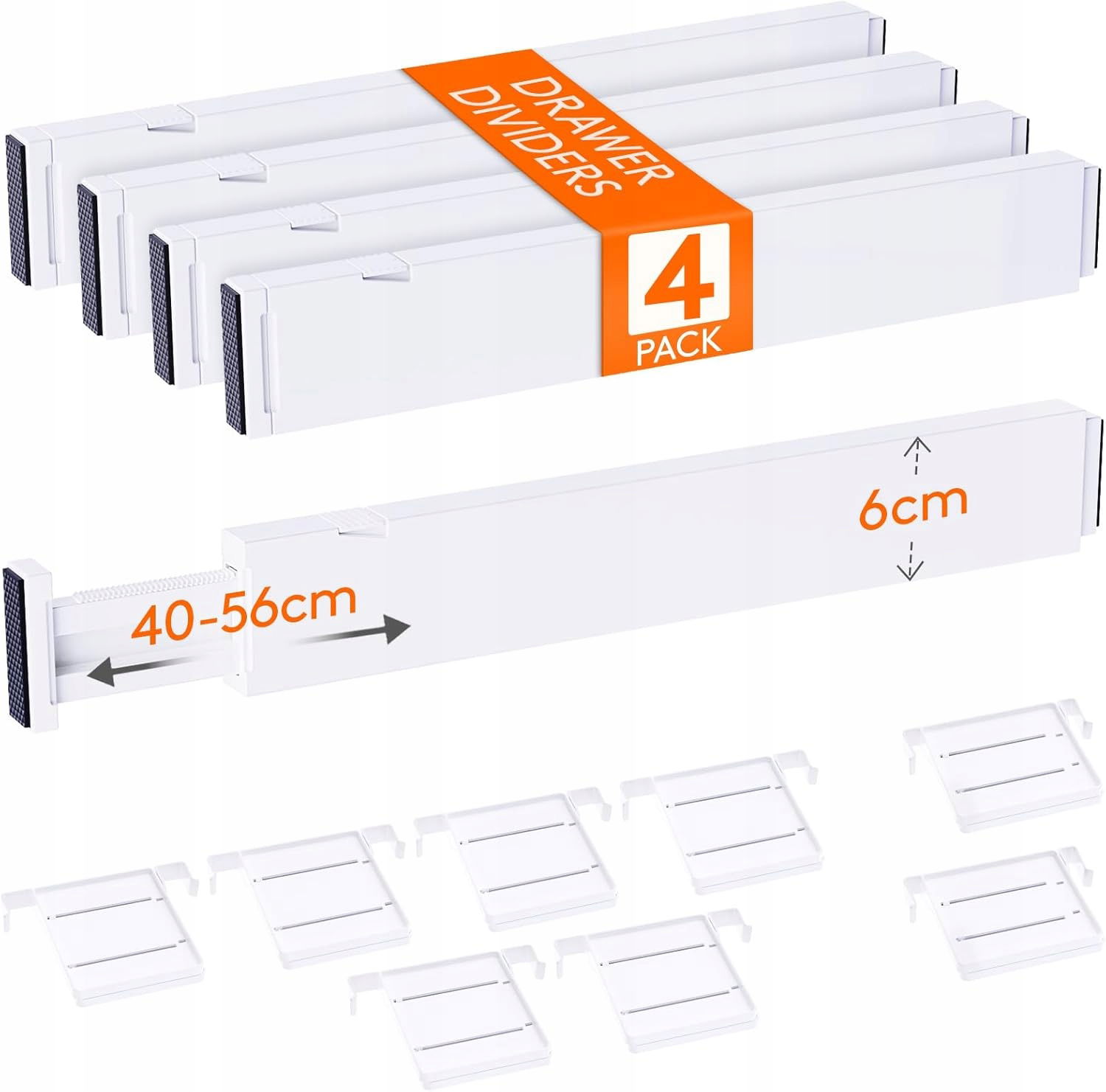 Regulowana długość – od 40,6 cm do 55,9 cm, wysokość 6 cm, szerokość 2 cm – pasuje do większości szuflad