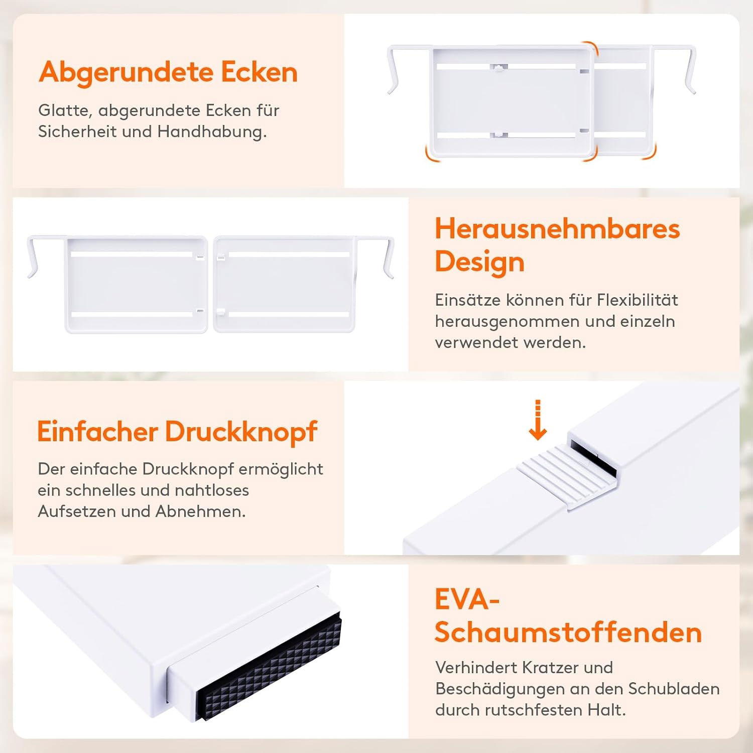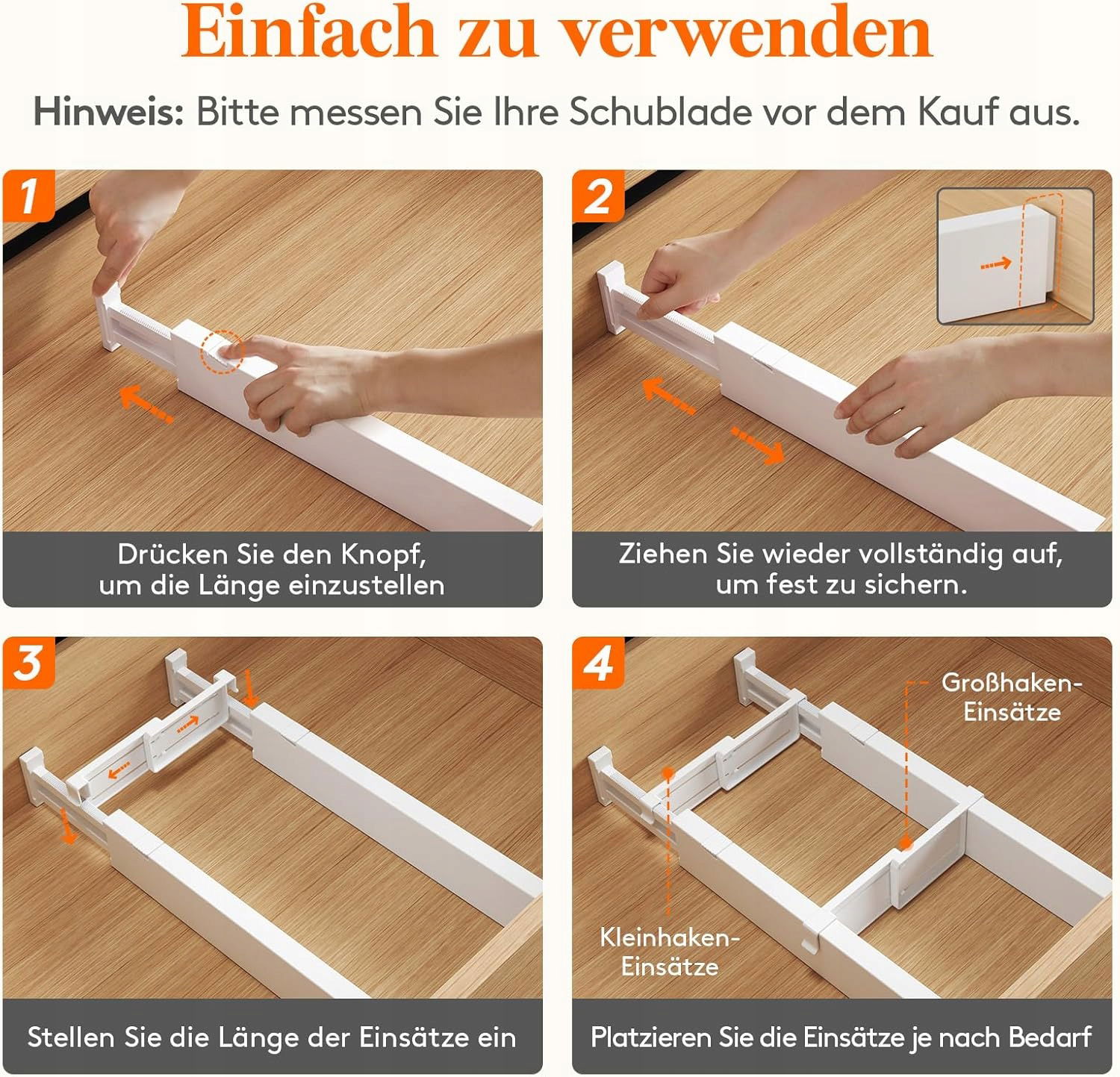 Zestaw 4 regulowanych przegródek Lifewit to idealne rozwiązanie, aby utrzymać porządek w szufladach. Dzięki regulowanej długości i mocnemu systemowi sprężynowemu dopasujesz je do większości szuflad w kuchni, biurze, sypialni czy łazience. Wykonane z wytrzymałego materiału ABS z wysokiej jakości gąbkami piankowymi EVA na końcach; gąbki te nie pozostawiają śladów ani pozostałości i chronią ścianki szuflad przed zarysowaniami i uszkodzeniami.