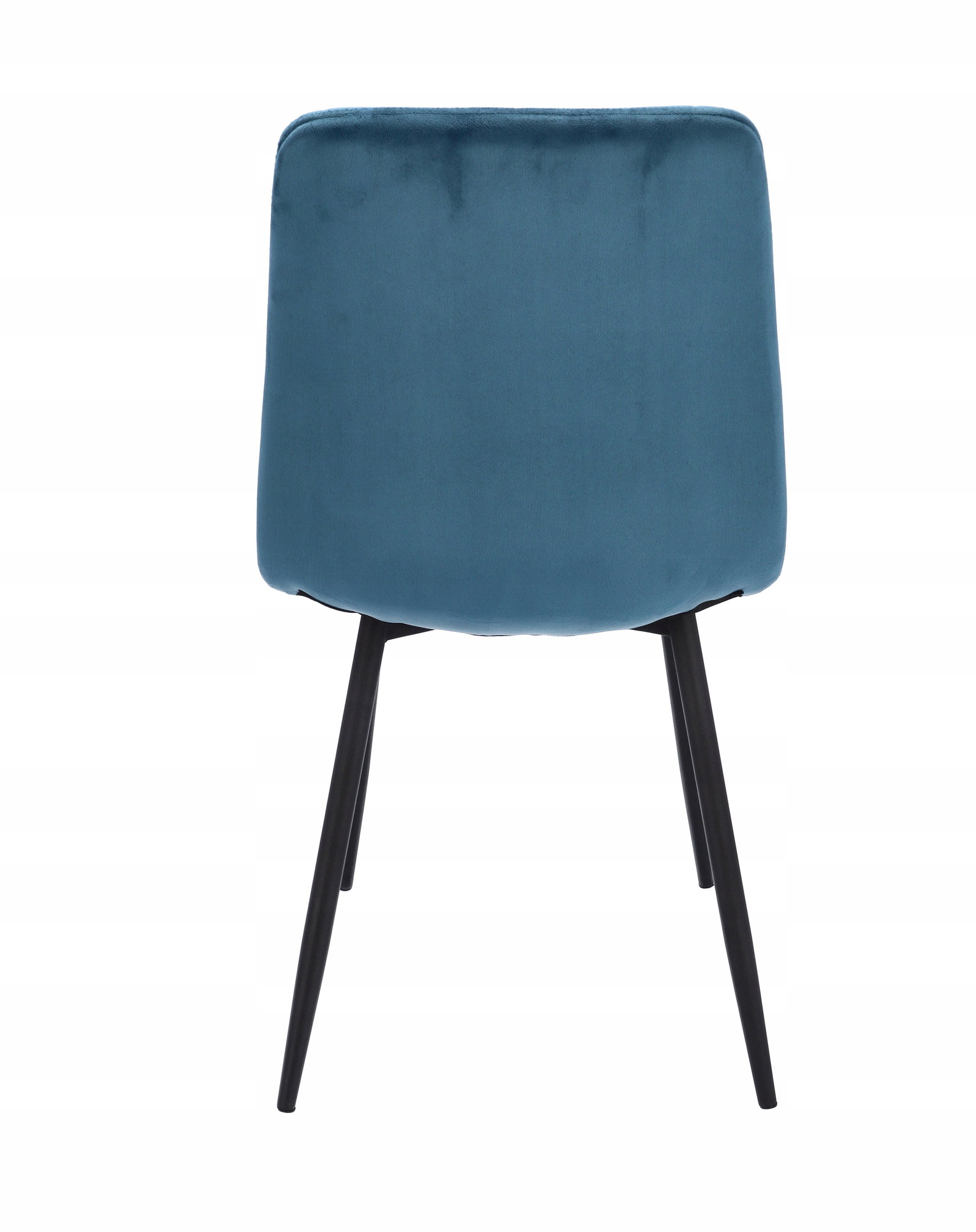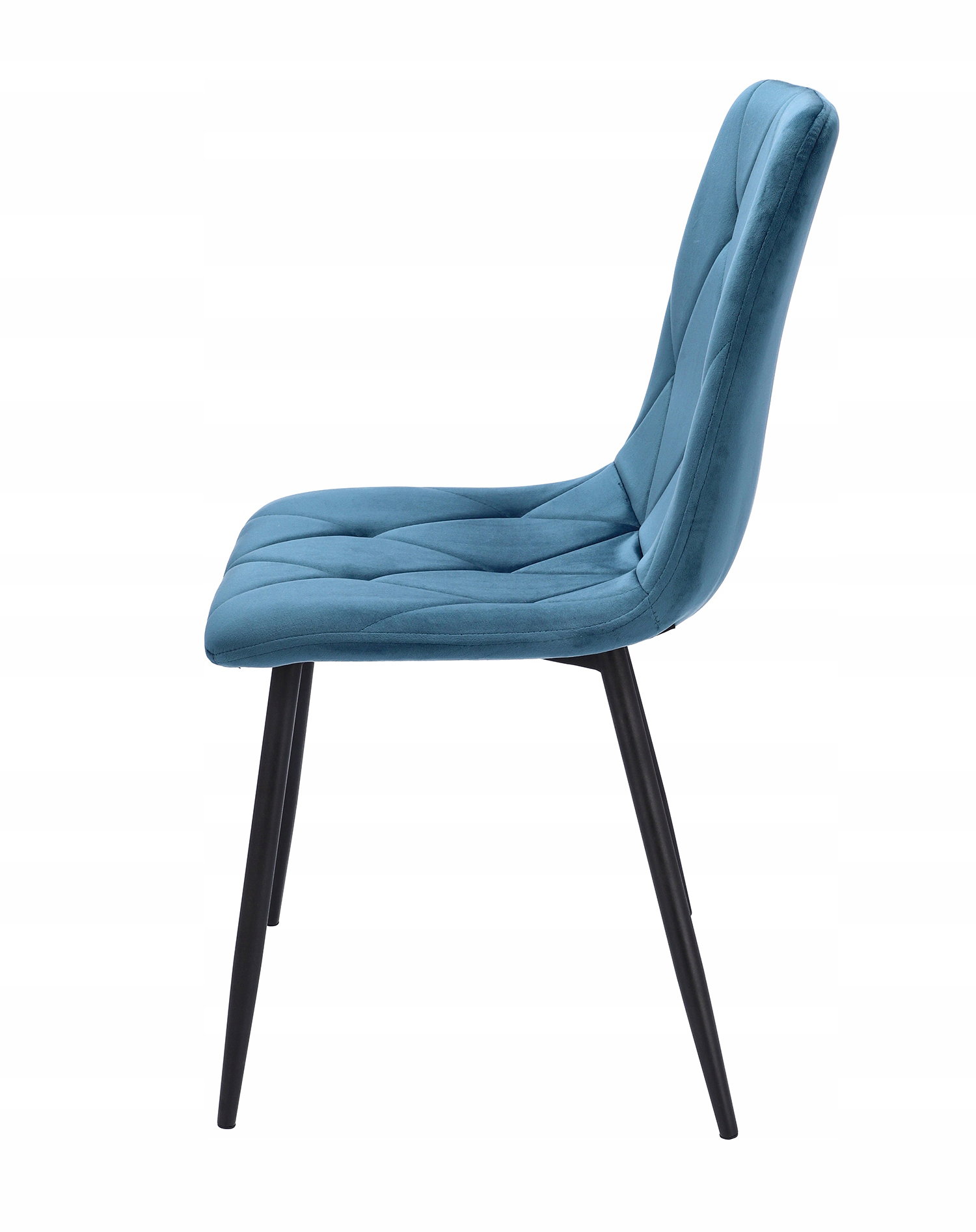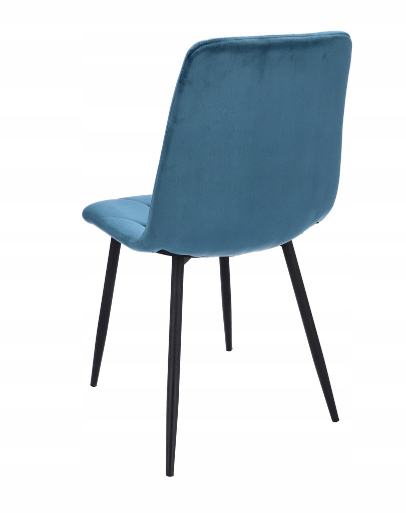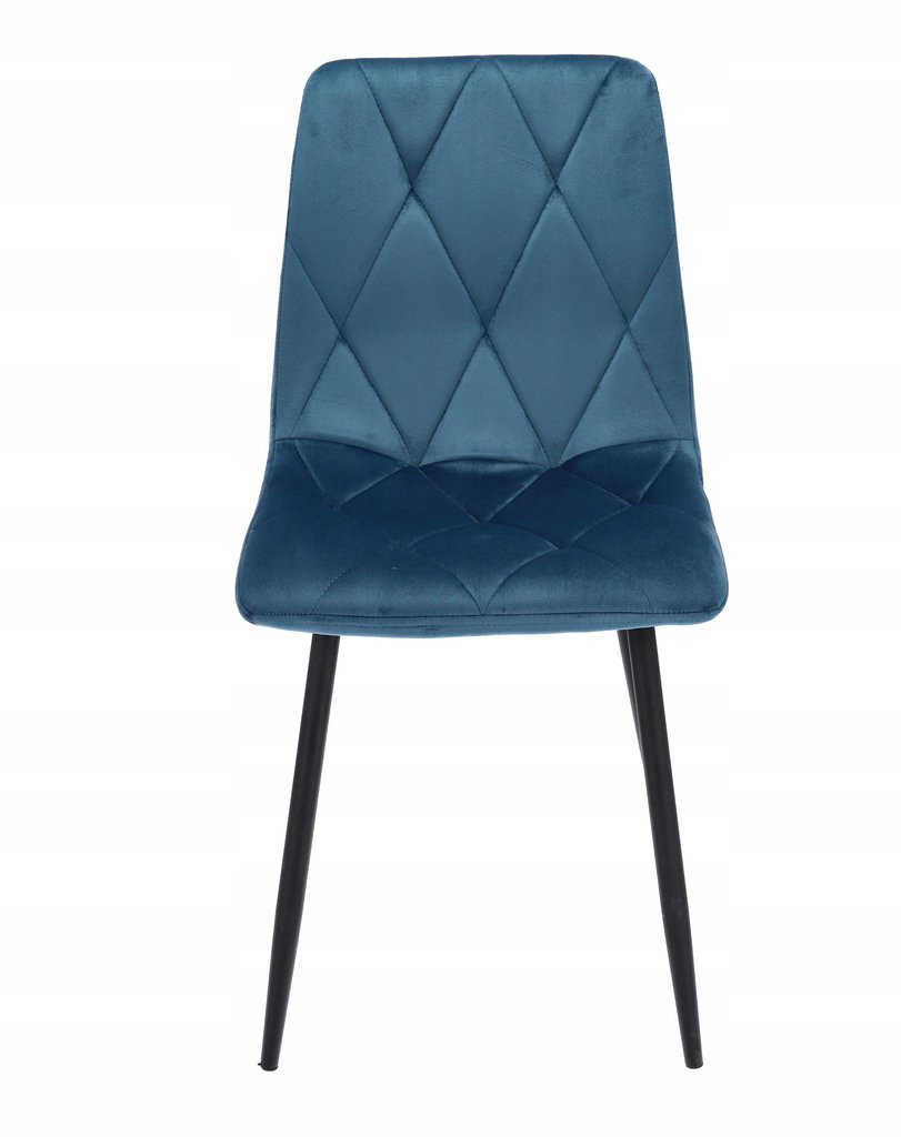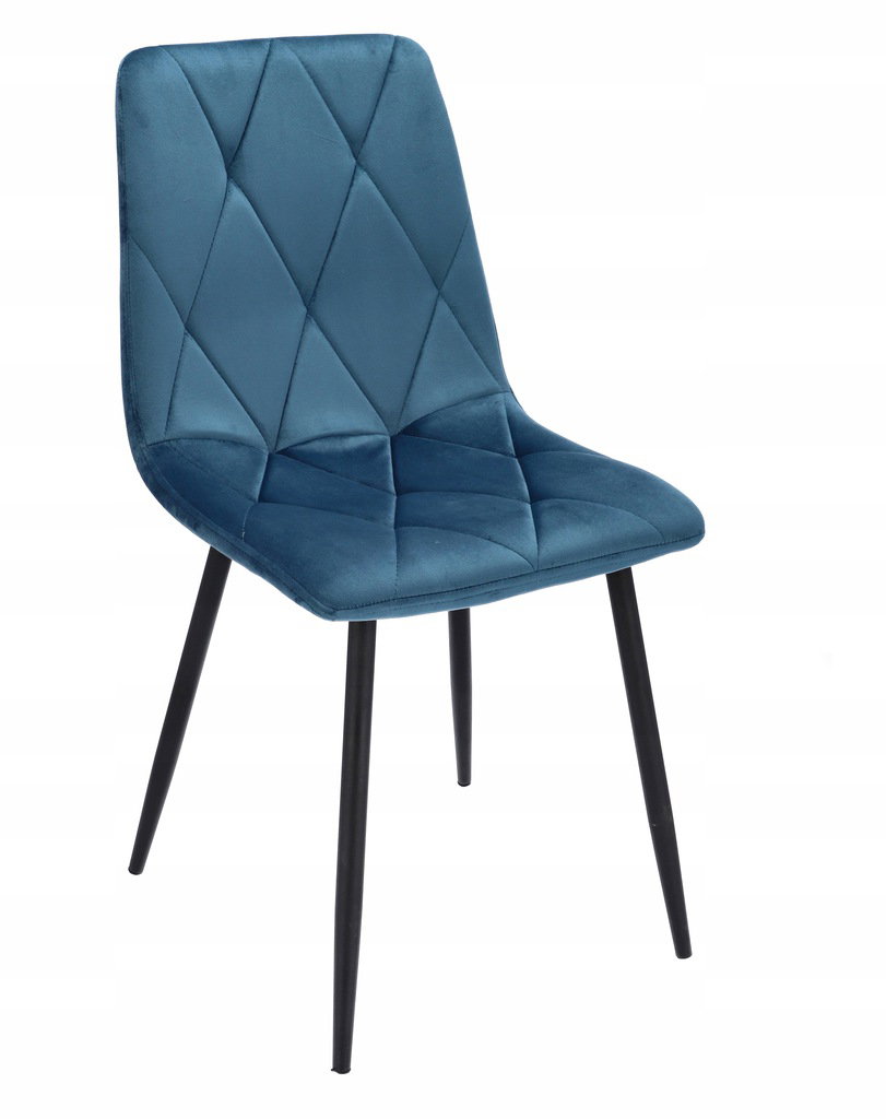 Krzesło tapicerowane są welurem, a po wewnętrznej stronie pikowane regularnymi przeszyciami w romby. Wysokie i smukłe nóżki w czarnym kolorze wyglądają bardzo szykownie oraz gwarantują idealną stabilność.