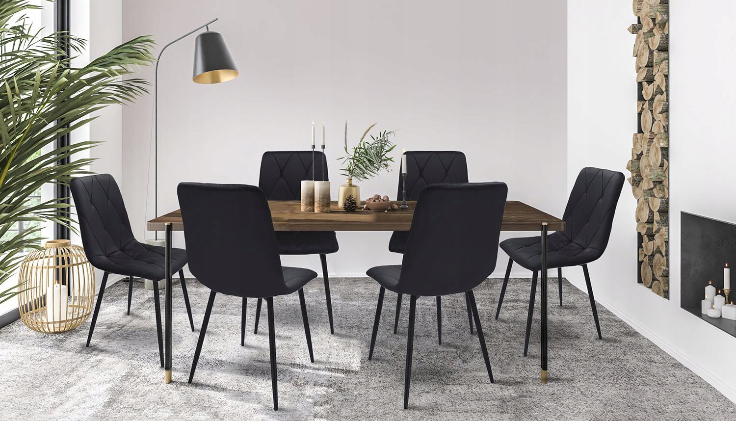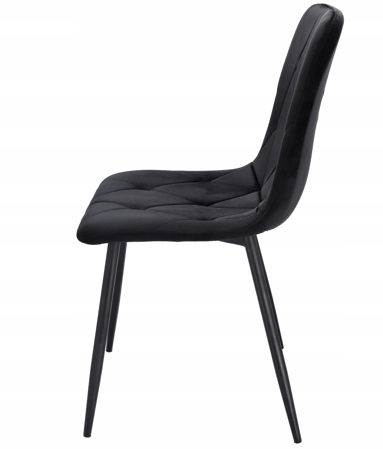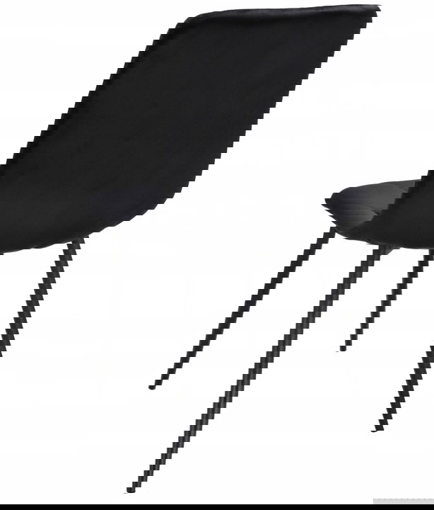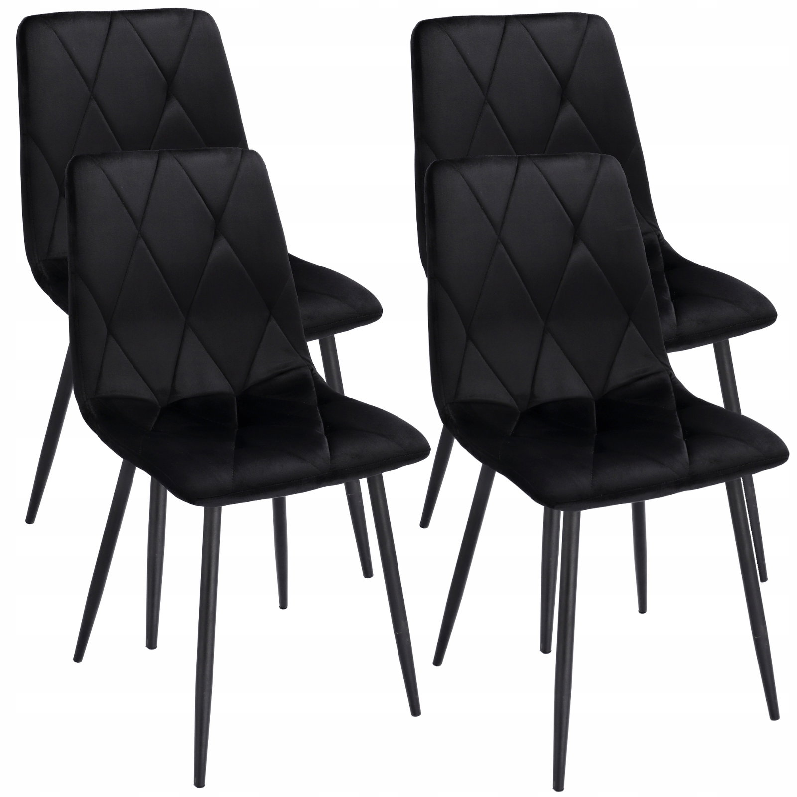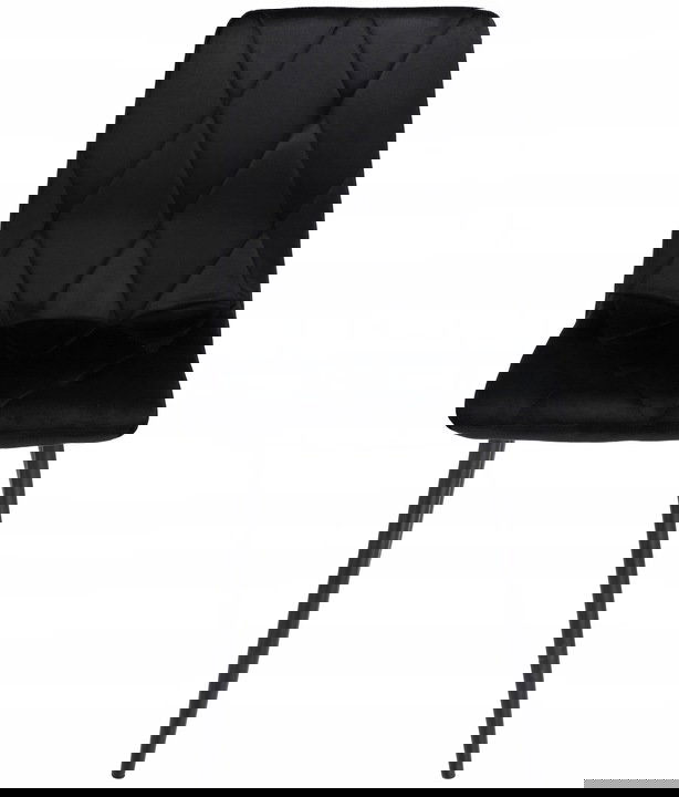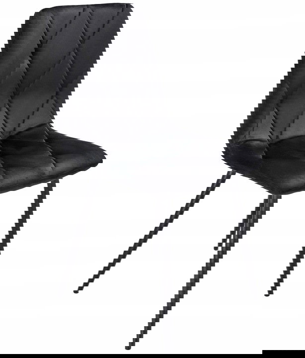 Krzesła tapicerowane są welurem, a po wewnętrznej stronie pikowane regularnymi przeszyciami w romby. Wysokie i smukłe nóżki w czarnym kolorze wyglądają bardzo szykownie oraz gwarantują idealną stabilność.