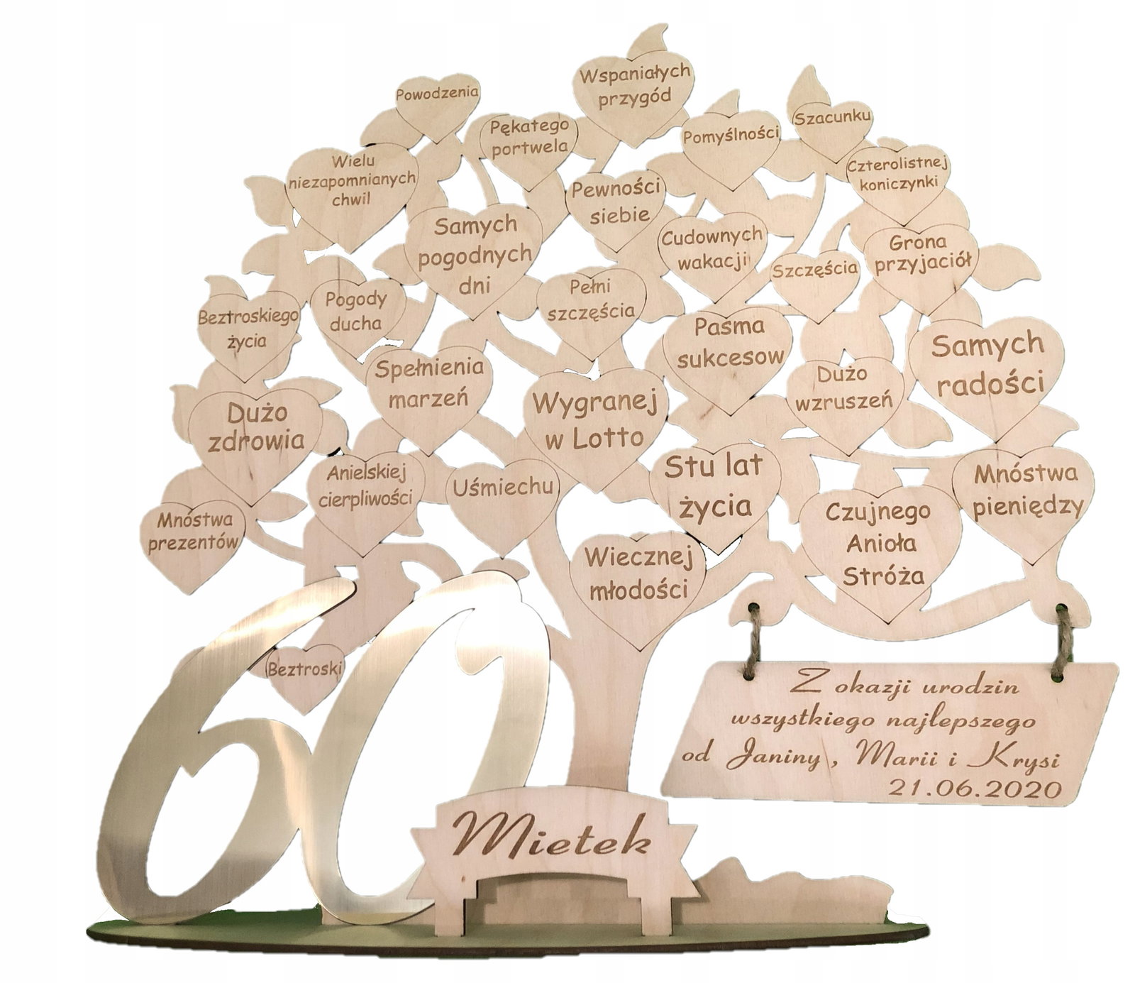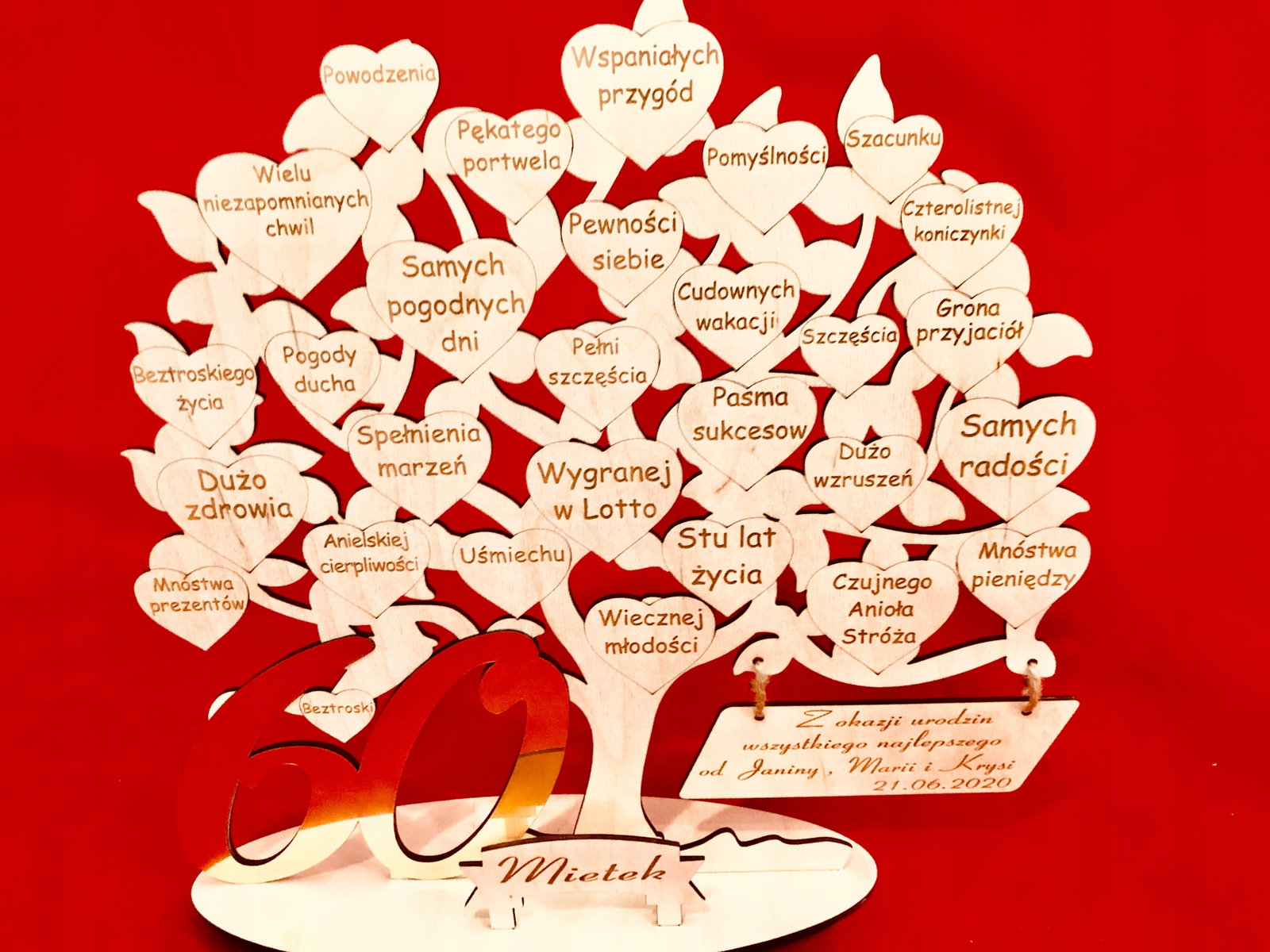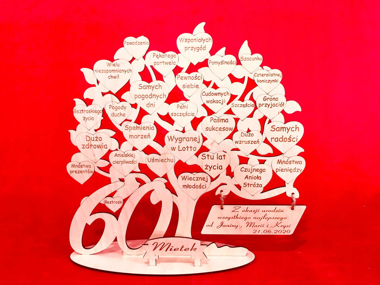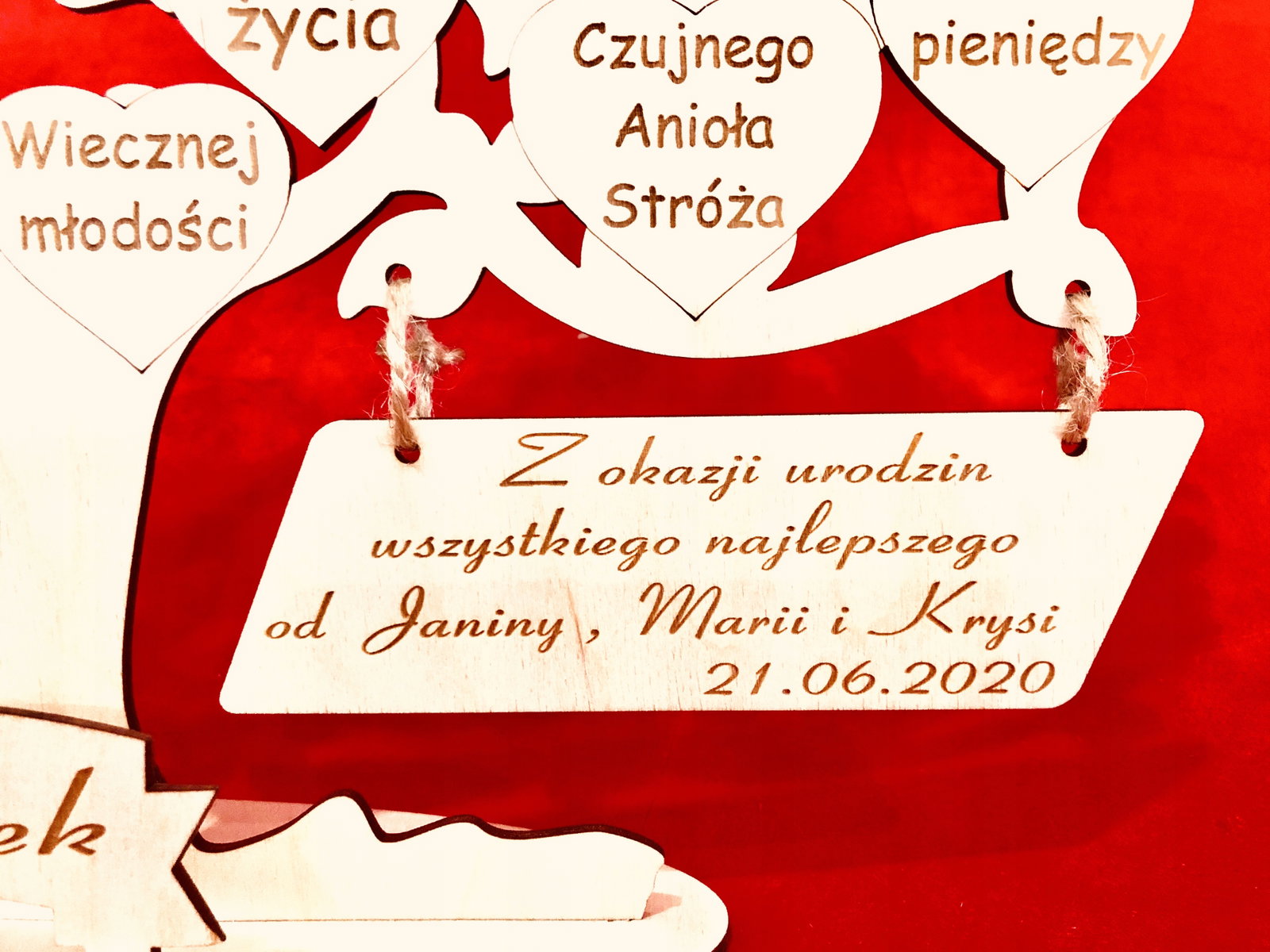 Przepięknie wycięte ze sklejki i grawerowane drzewko z życzeniami dla solenizanta.