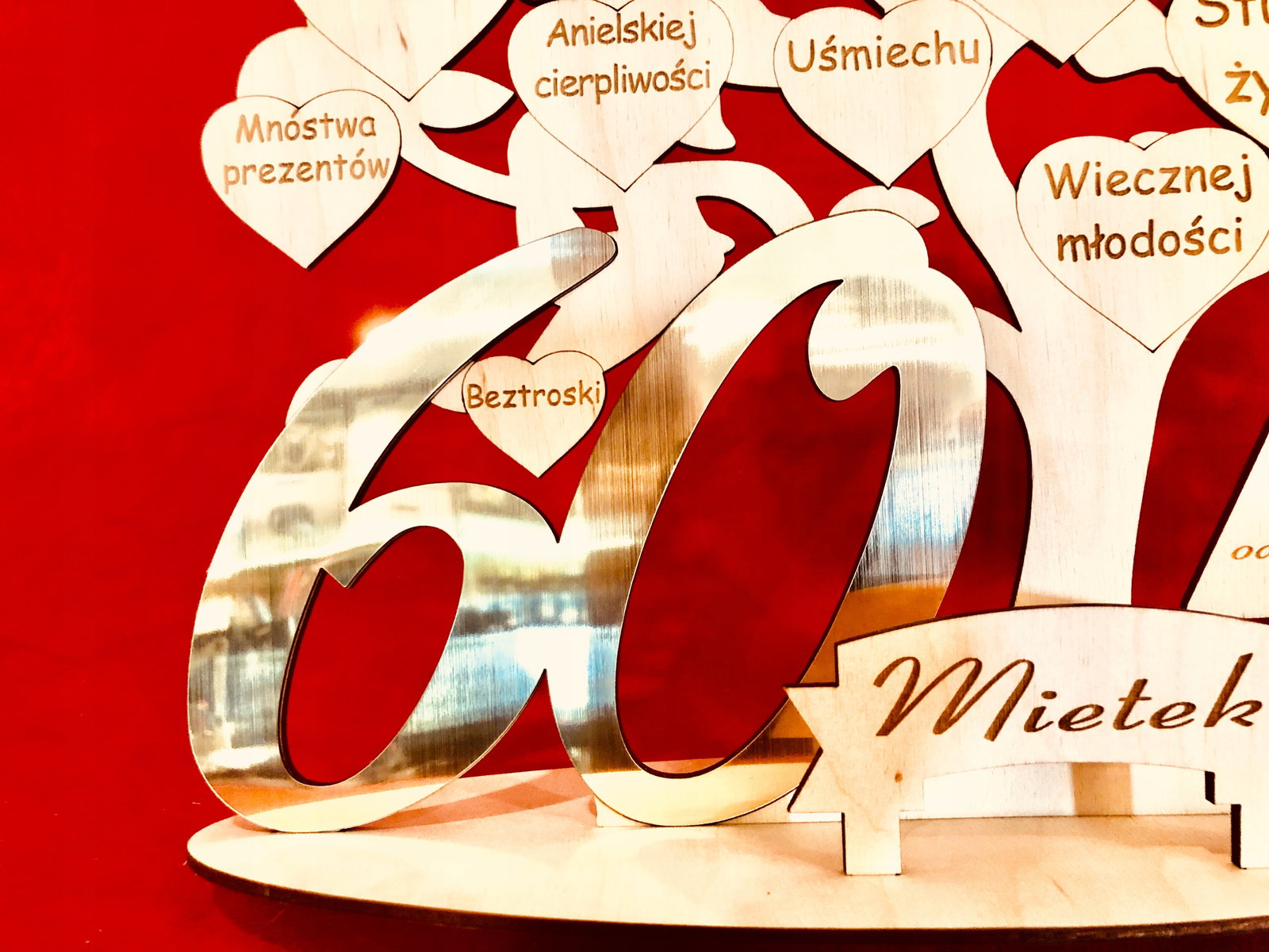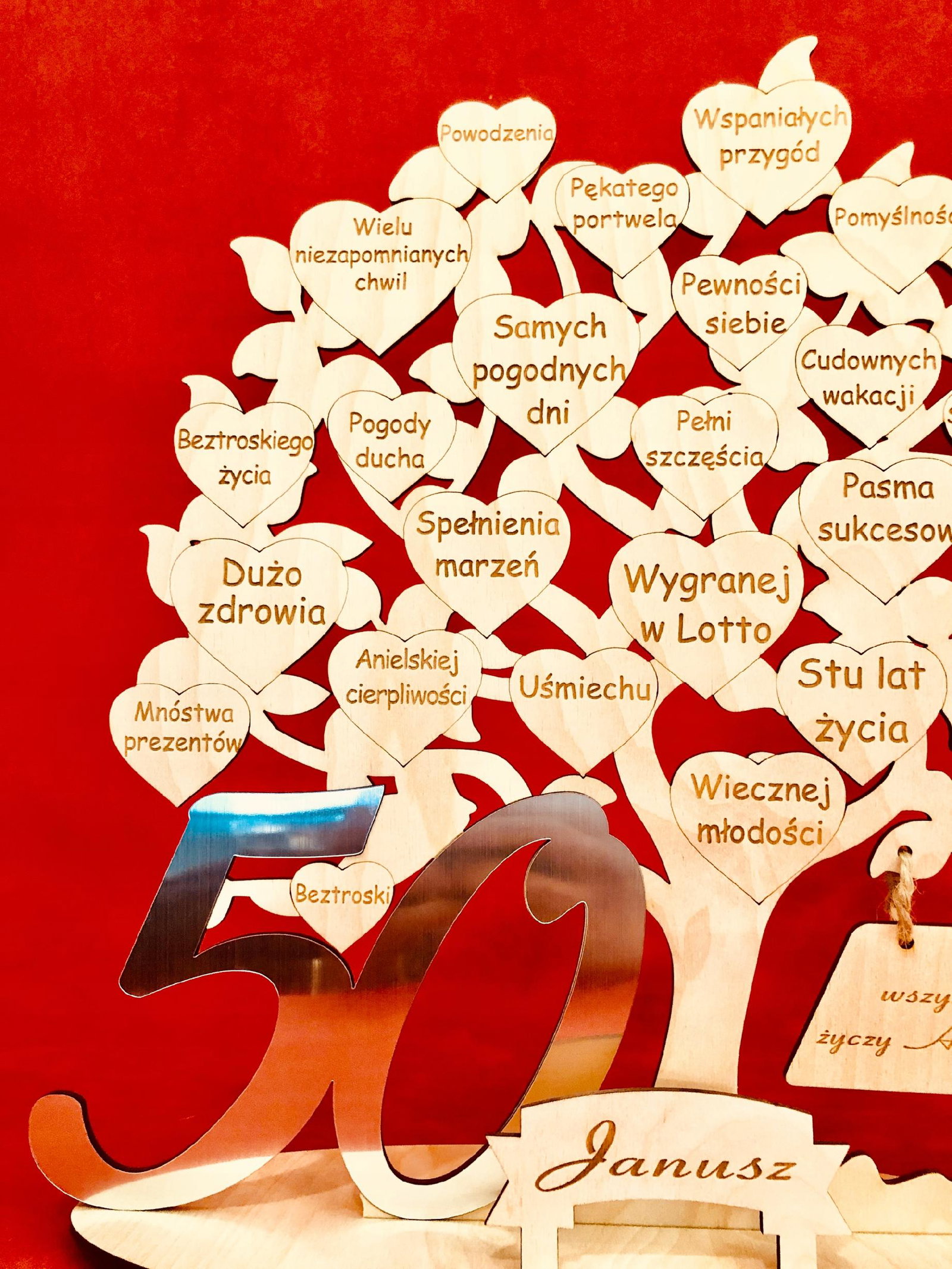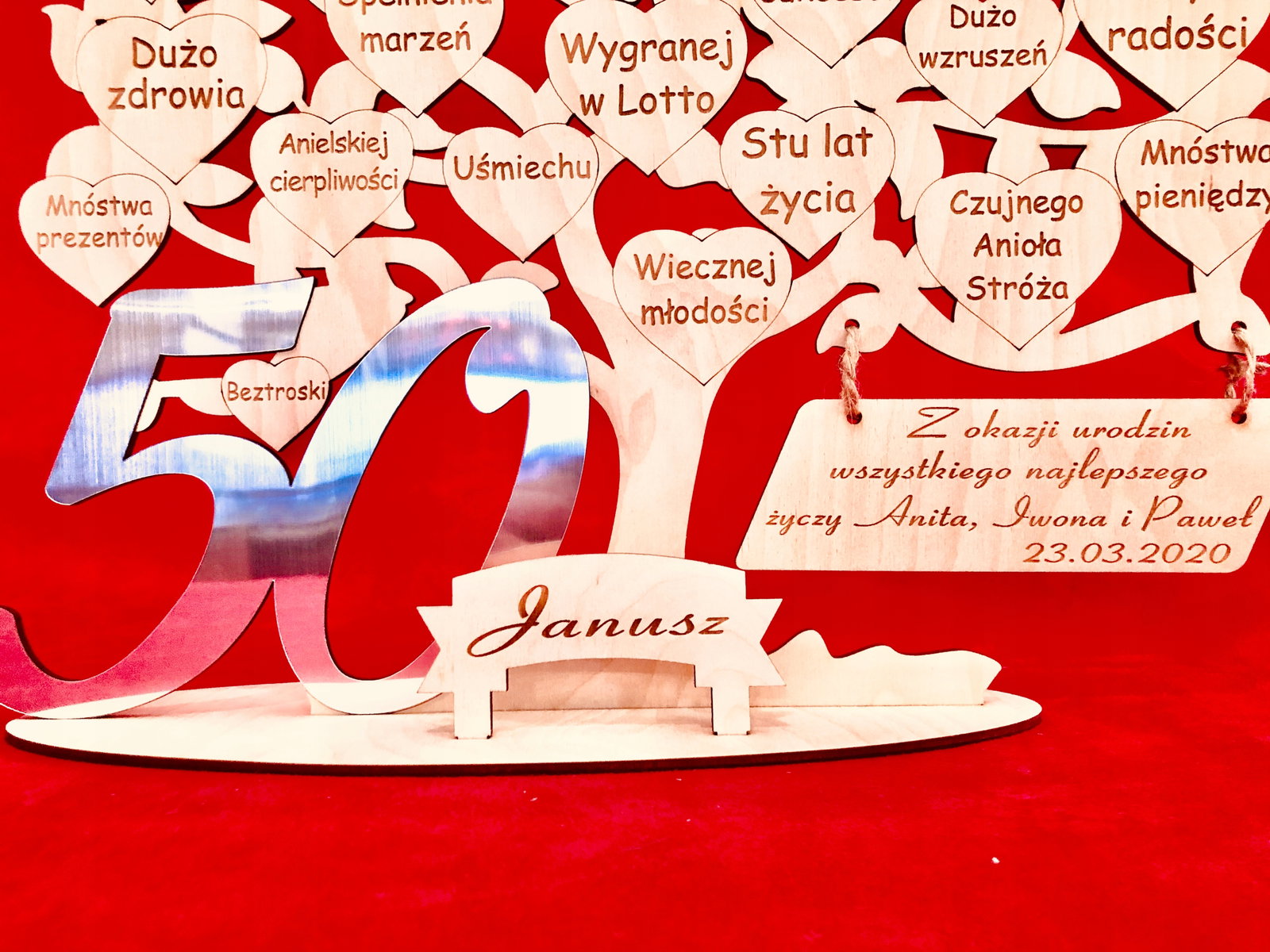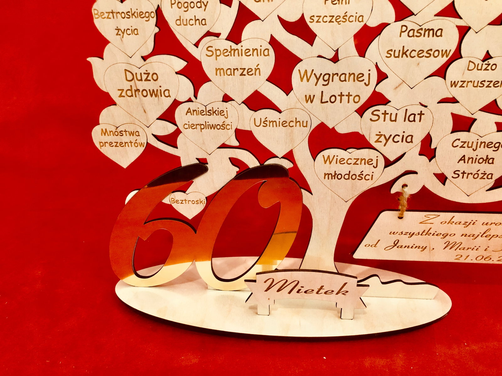 Przepięknie wycięte ze sklejki i grawerowane drzewko z życzeniami dla solenizanta.