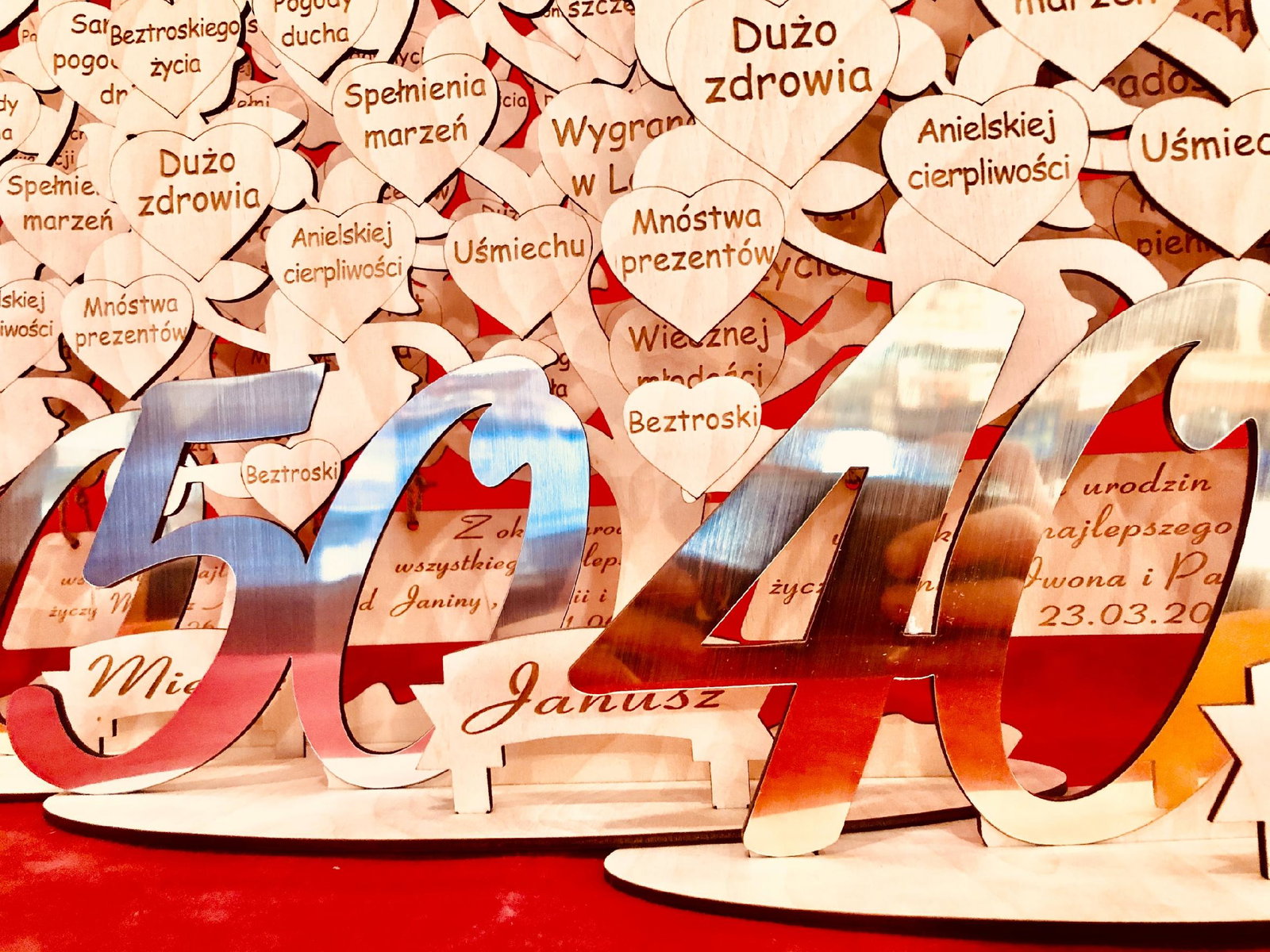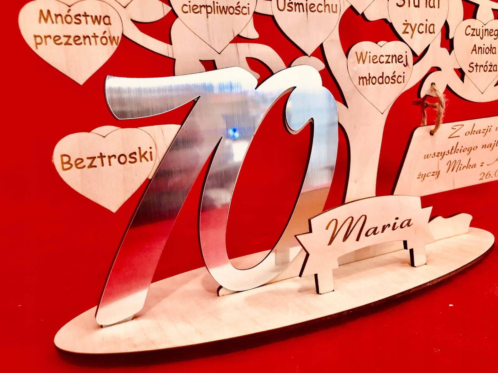 Prezent na urodziny w formie grawerowanego drzewka z życzeniami i cyframi ze złotego lub srebrnego laminatu grawerskiego, autorstwa naszej autorskiej pracowni grawerskiej GRAWERNIADDZ.