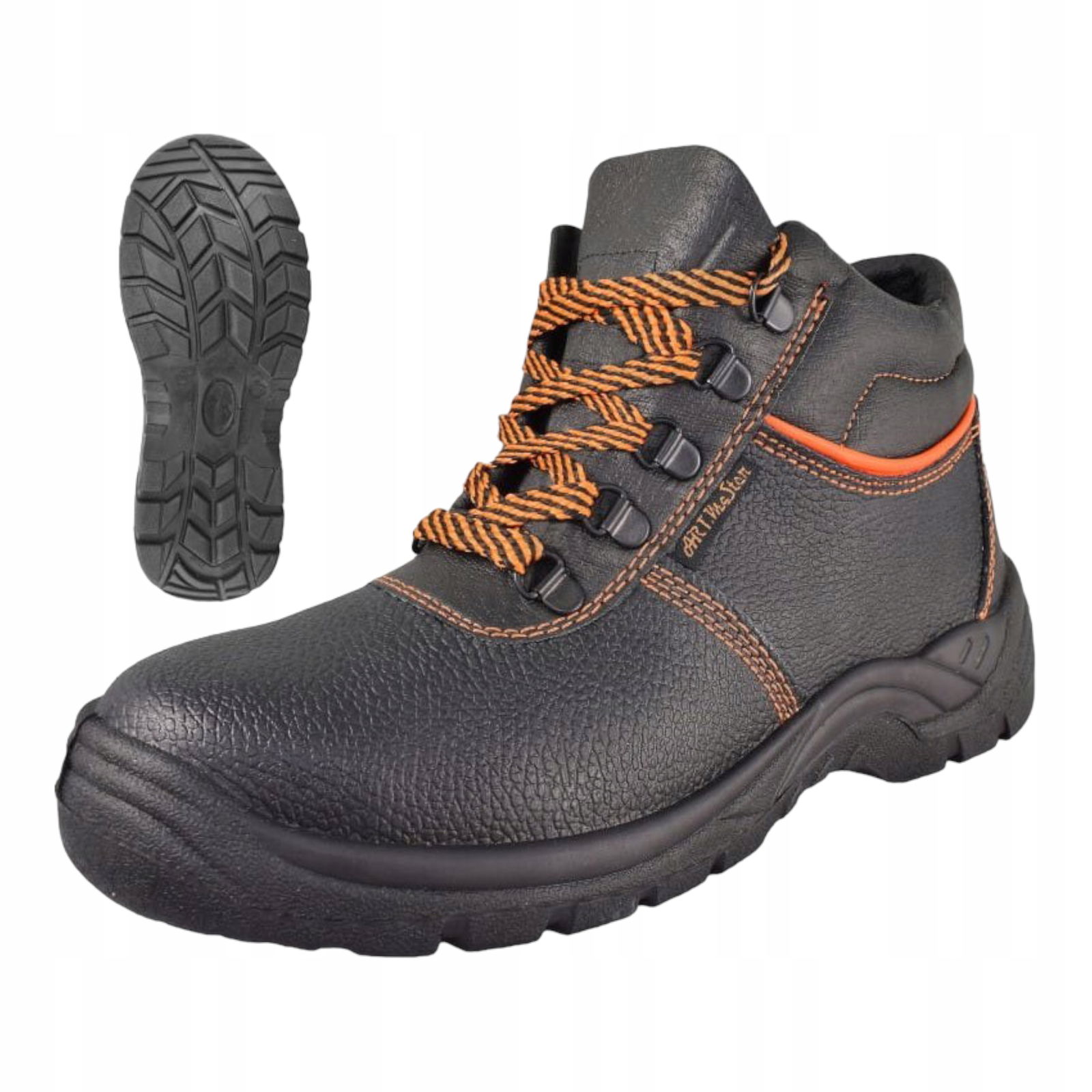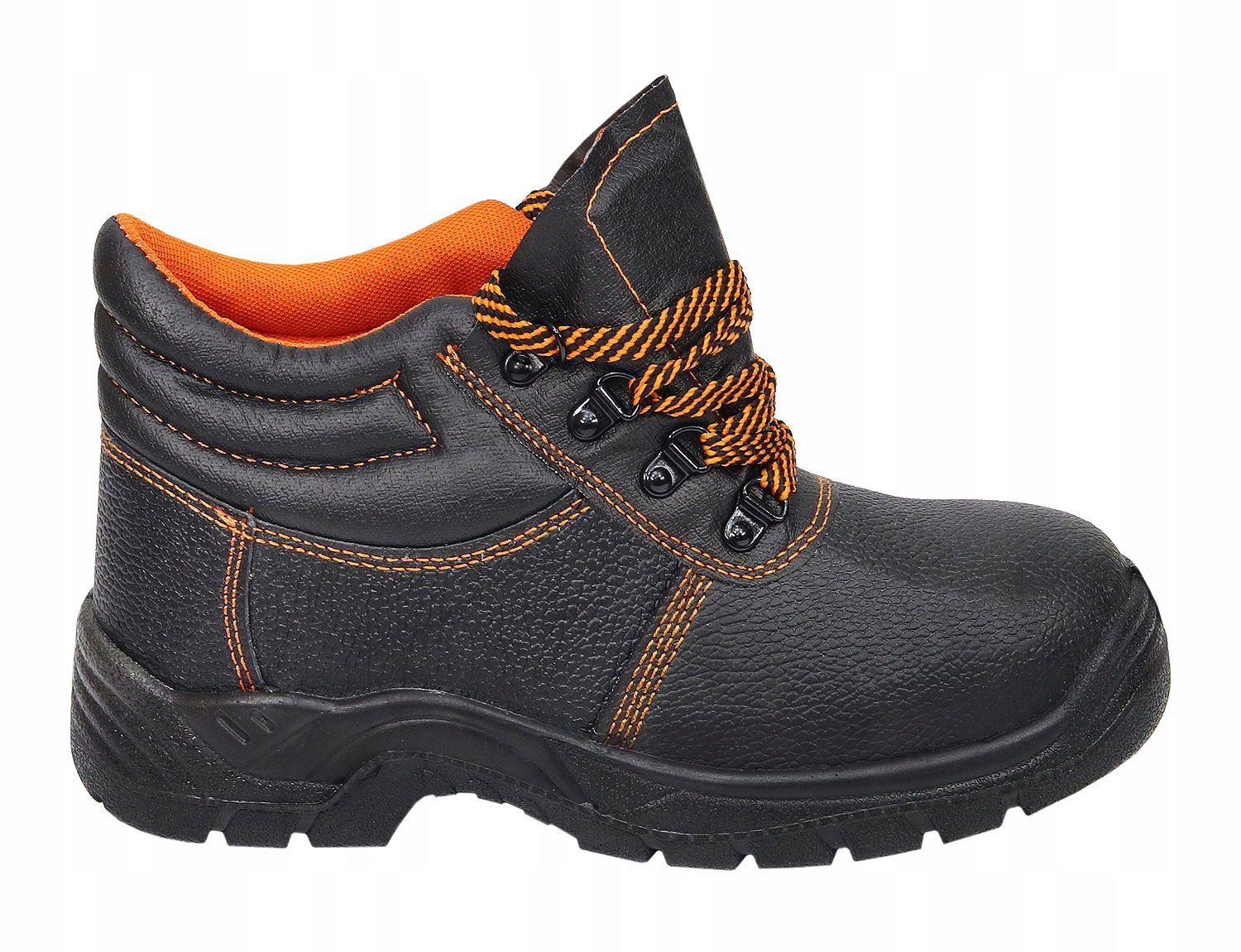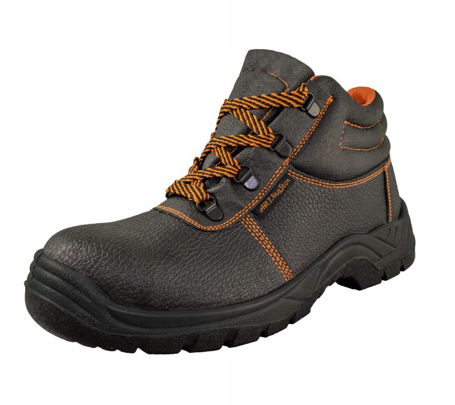 Buty robocze: trzewik ochronny bez podnoska, wykonany ze skóry bydlęcej tłoczonej w kolorze czarnym.