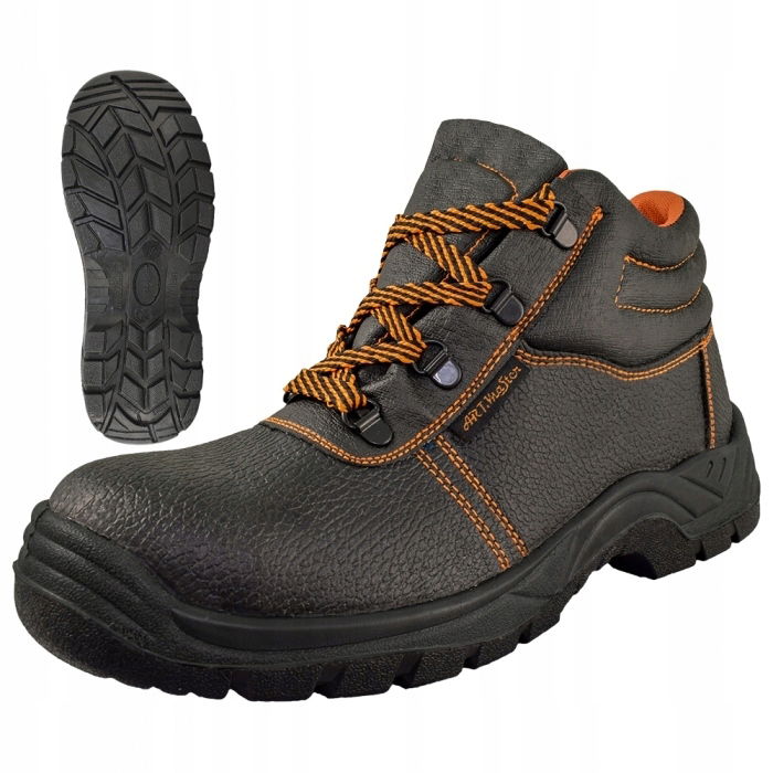 Cholewka wysoka wykonana ze skór bydlęcych tłoczonych w kolorze czarnym. Podeszwa PU, montaż przez bezpośredni wtrysk, odporna na olej, benzynę i inne rozpuszczalniki organiczne, chroniaca przed poślizgiem, absorber energii w pięcie.