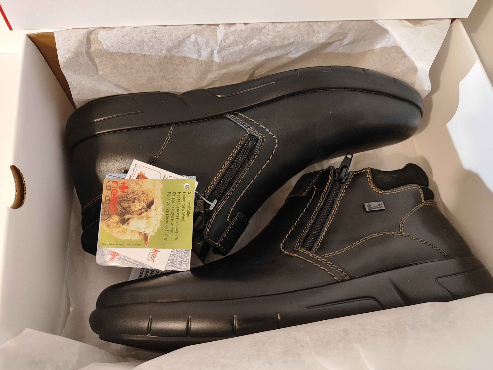 - Technologie: lekka i elastyczna konstrukcja charakterystyczna dla marki Rieker (Riker-Tex)