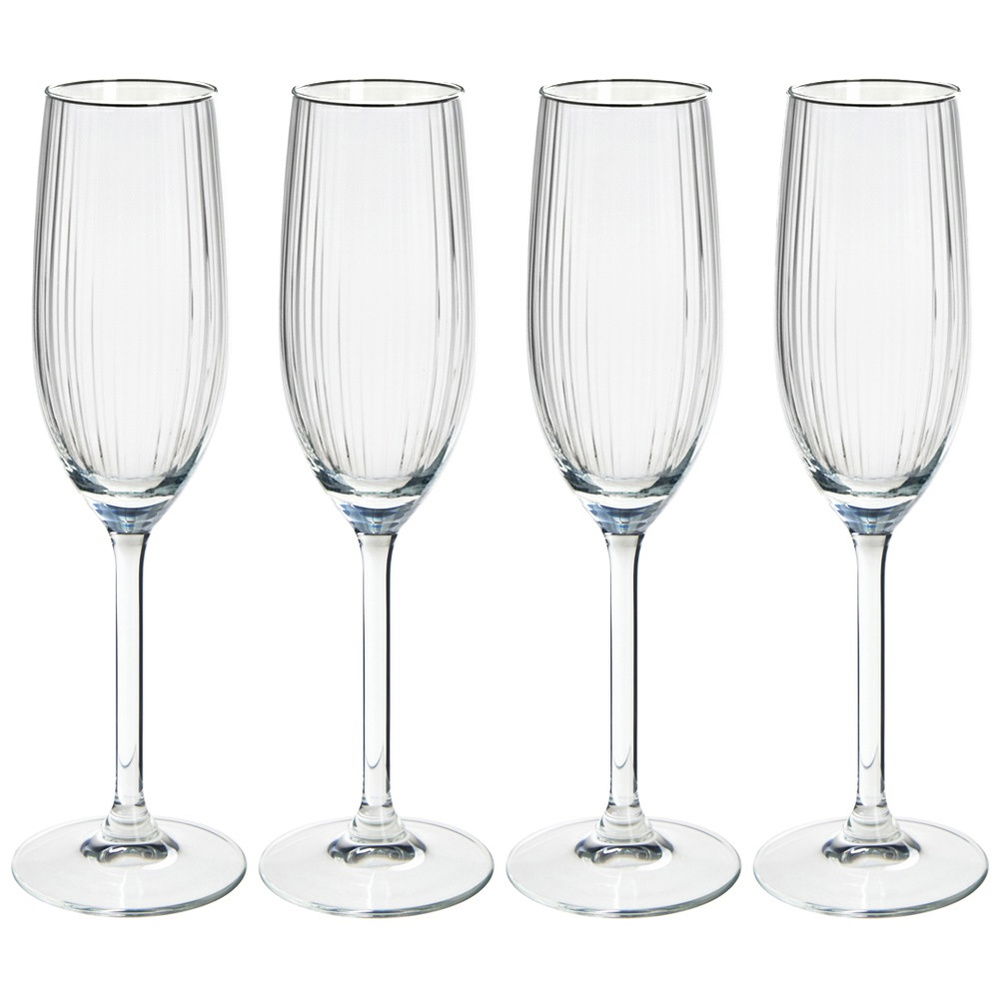 Zestaw 4 kieliszków do szampana - Elegancki komplet kieliszków przeznaczony do serwowania szampana, prosecco oraz innych win musujących. Każdy kieliszek ma pojemność 210 ml, średnicę 4,5 cm i wysokość 23 cm.