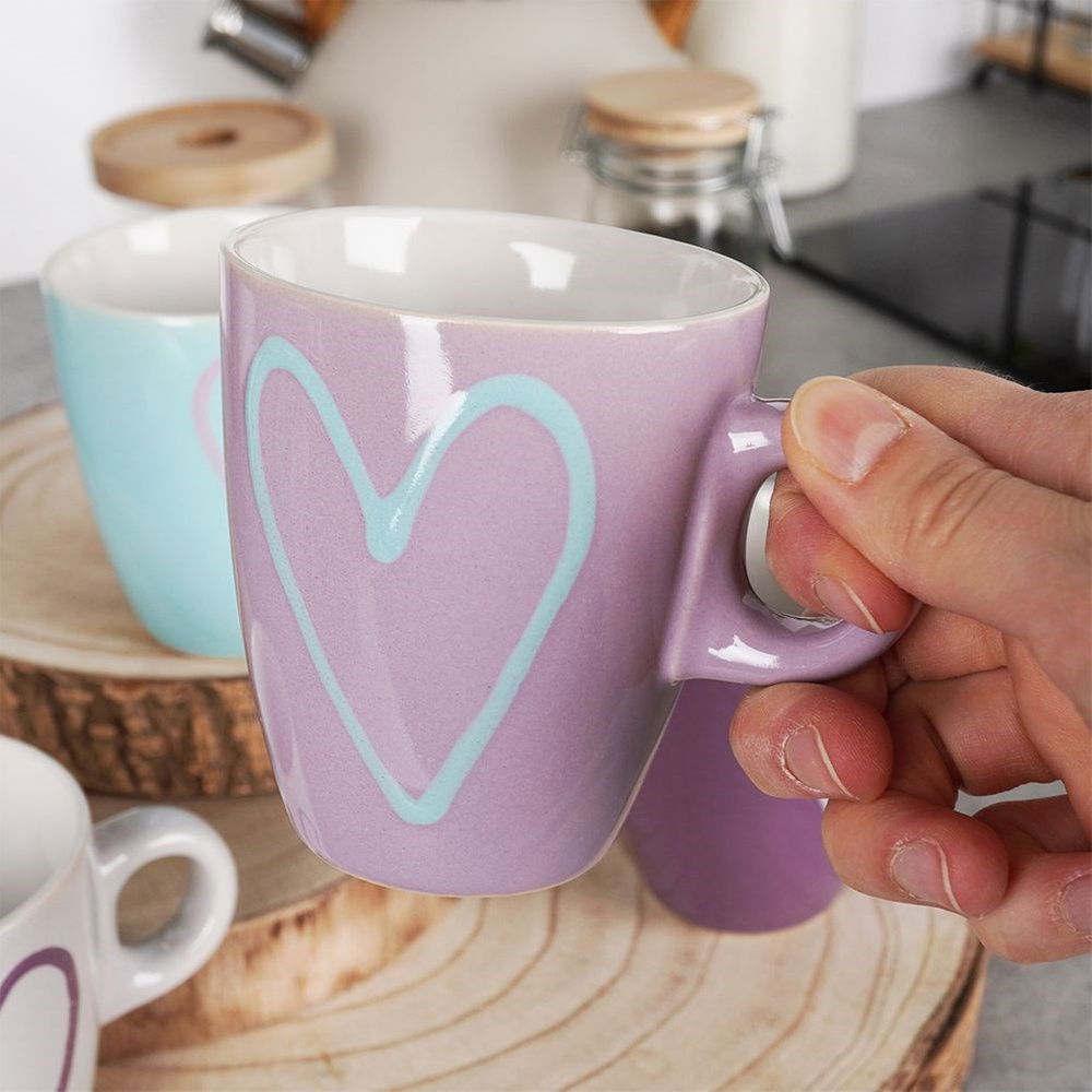 CERAMICZNE - Wykonane z wysokiej jakości ceramiki w czterech różnych kolorach, każdy z kubków ma motyw serca. Odpowiednio użytkowane posłużą długie lata.