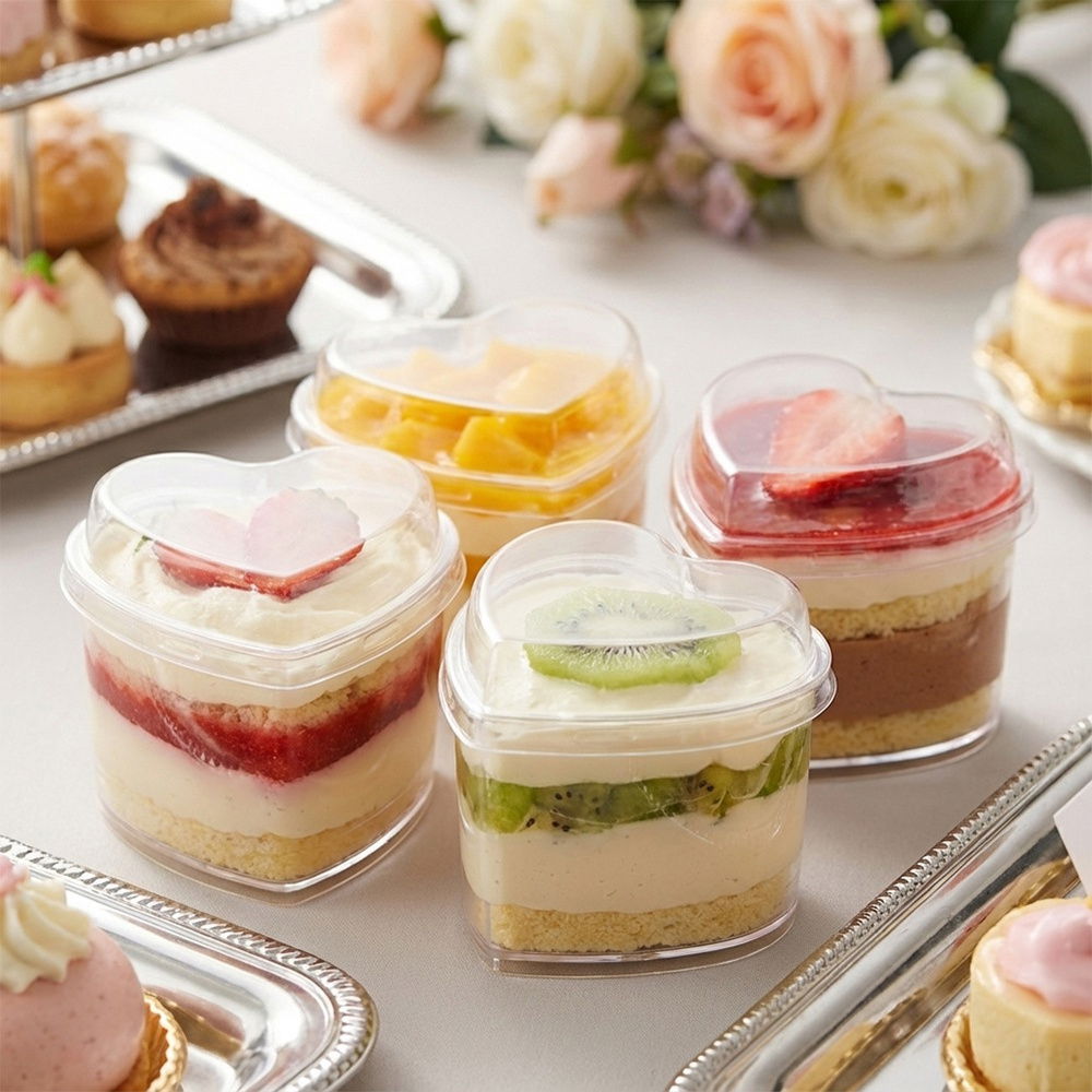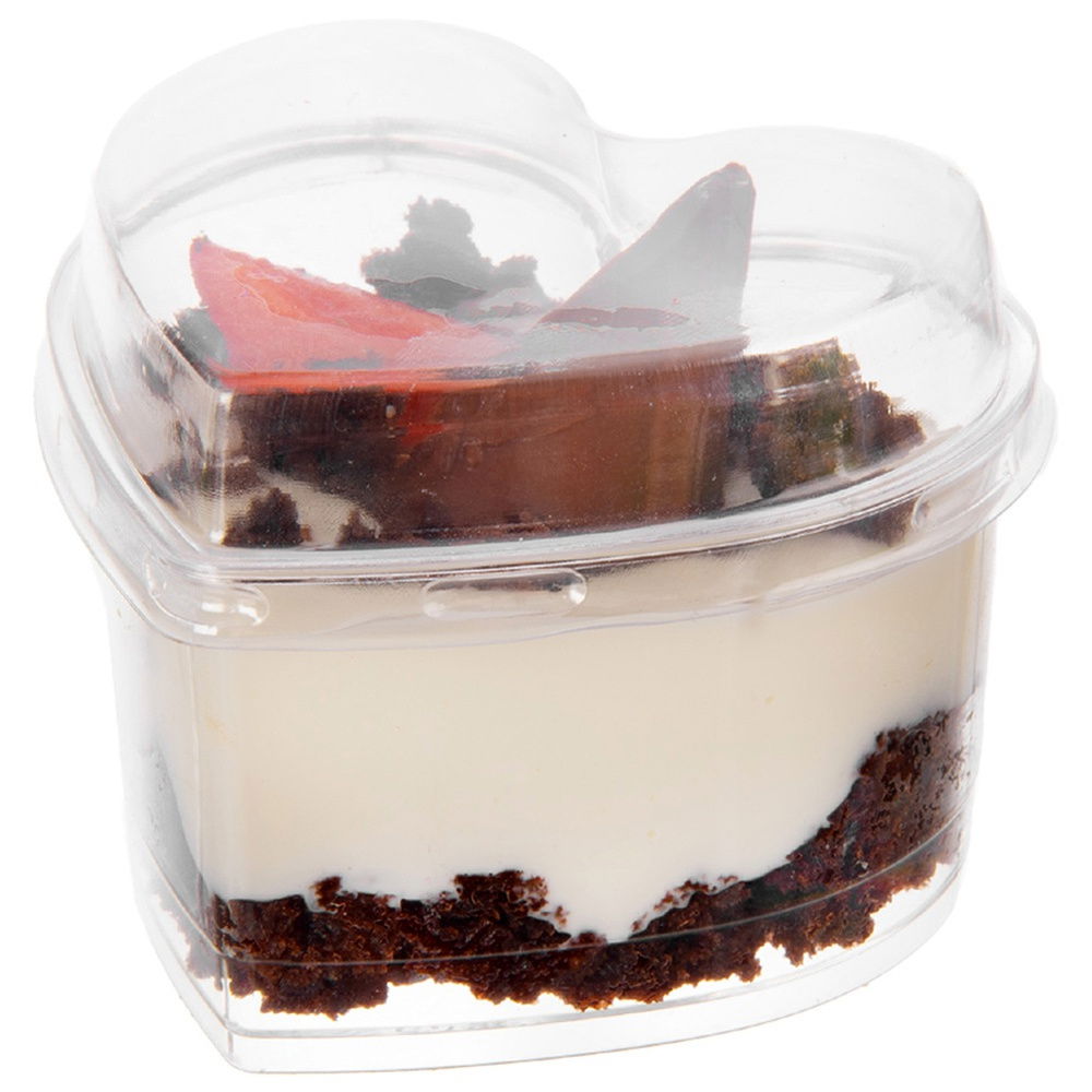 Zestaw 4 szt. pucharków na desery i przekąski z pokrywkami - Zestaw czterech pucharków w kształcie serca z pokrywkami. Wymiar każdego pojemnika to 8 x 7,5 x 4,5 cm, wysokość z pokrywką wynosi 6,5 cm, a pojemność 130 ml. Doskonale sprawdzą się do serwowania zarówno słodkich, jak i słonych przekąsek.