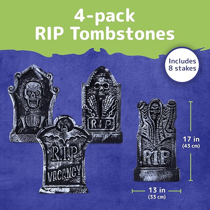 Szybka instalacja: dzięki 8 dołączonym słupkom nagrobki można bezpiecznie zakotwiczyć w ziemi. Szybki i stabilny montaż, dzięki czemu bez problemu można zmontować dekorację na Halloween