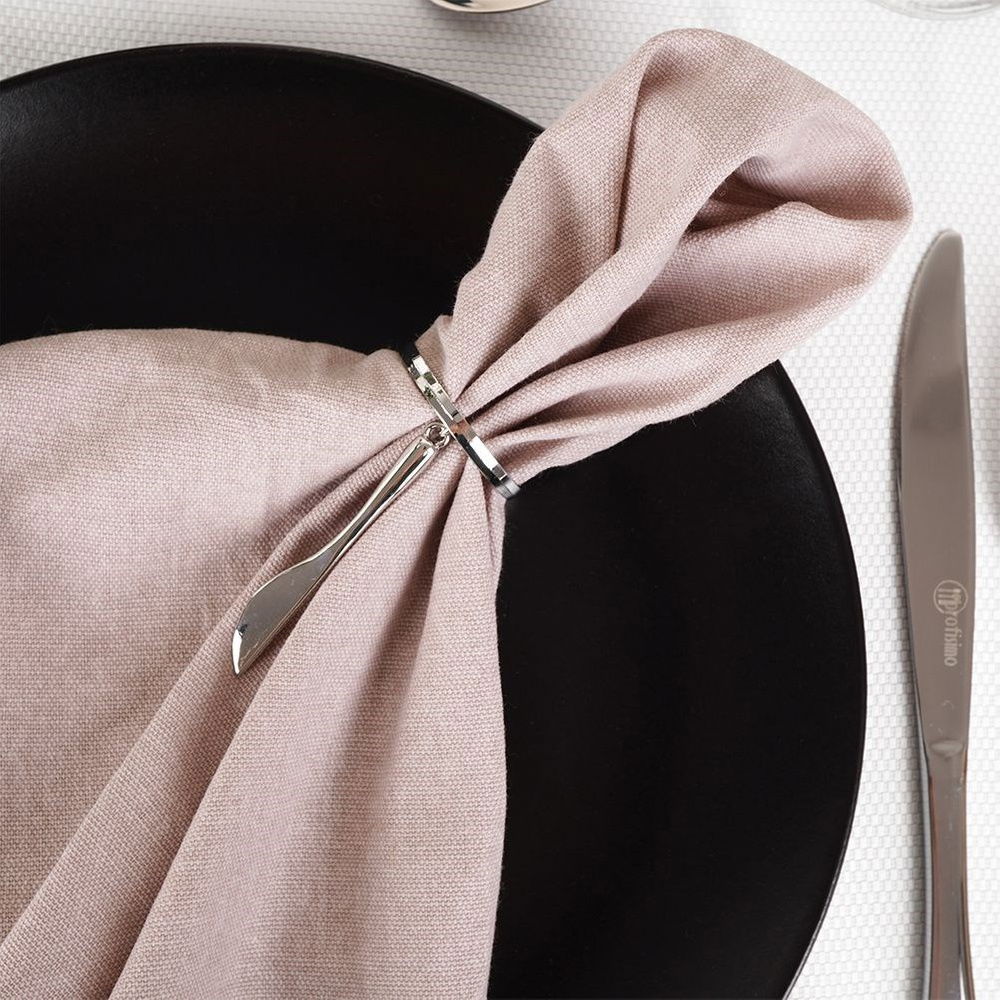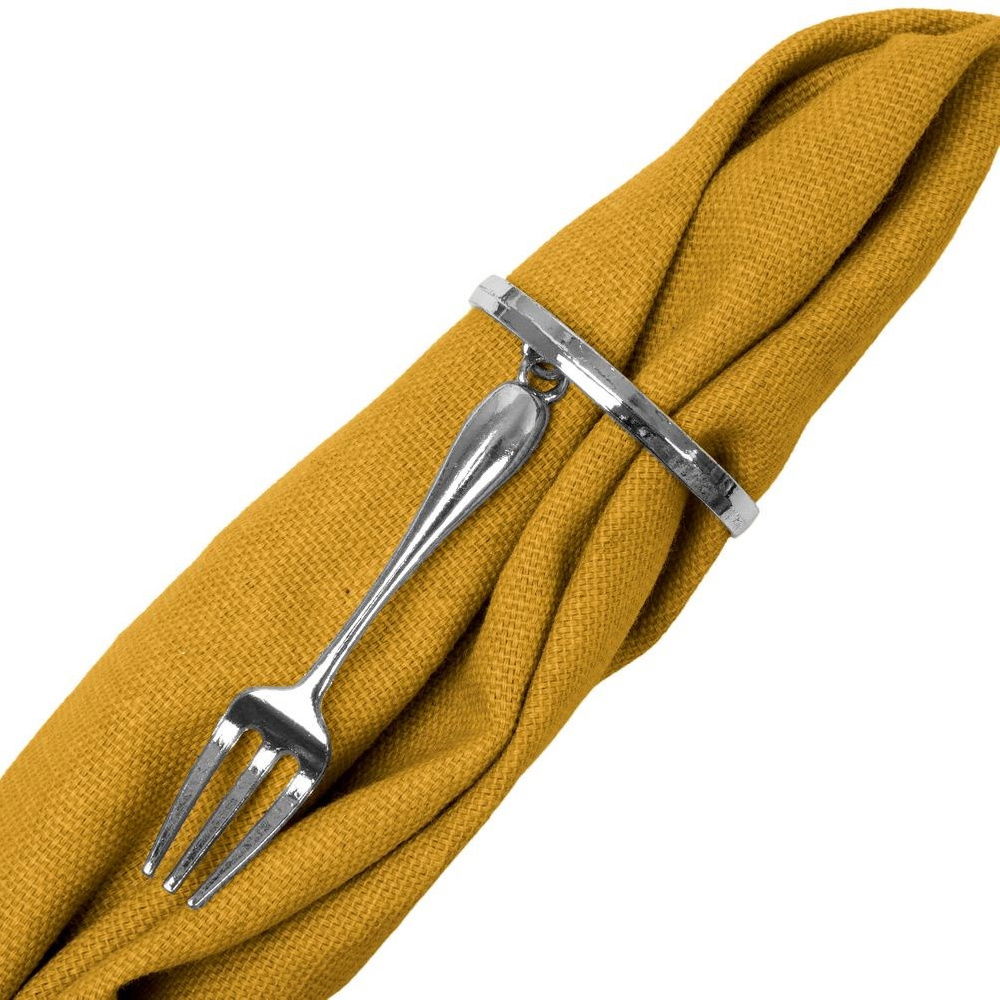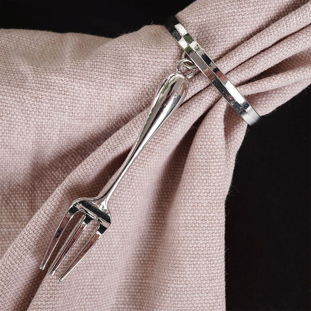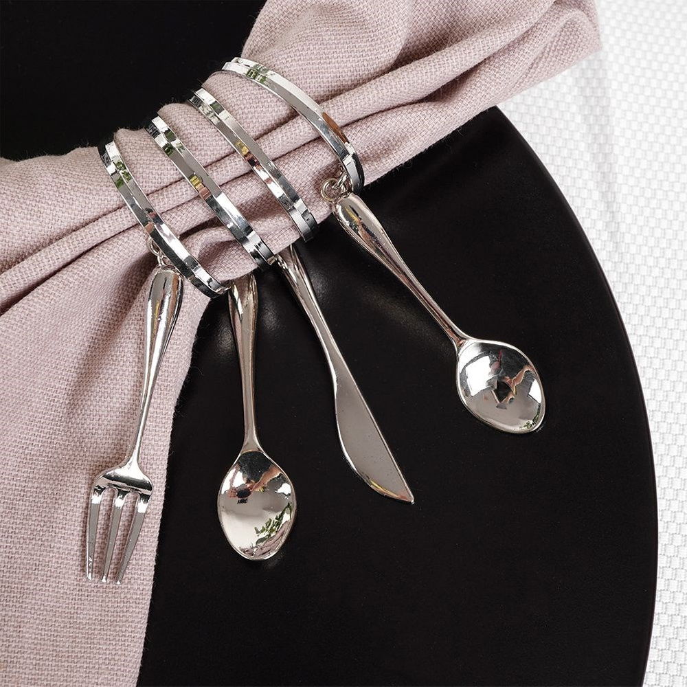 Zestaw czterech pierścieni do serwet. Pierścienie prezentują się bardzo elegancko. Posiadają efektowne sztućce, które dodają im wyjątkowego wyglądu. Dzięki obrączkom na serwetki stół zyska niepowtarzalny wygląd. Pierścienie są bardzo starannie wykonane i możemy używać ich wielokrotnie, podczas wszystkich ważnych uroczystości. Świetny pomysł na prezent np. z okazji parapetówki.