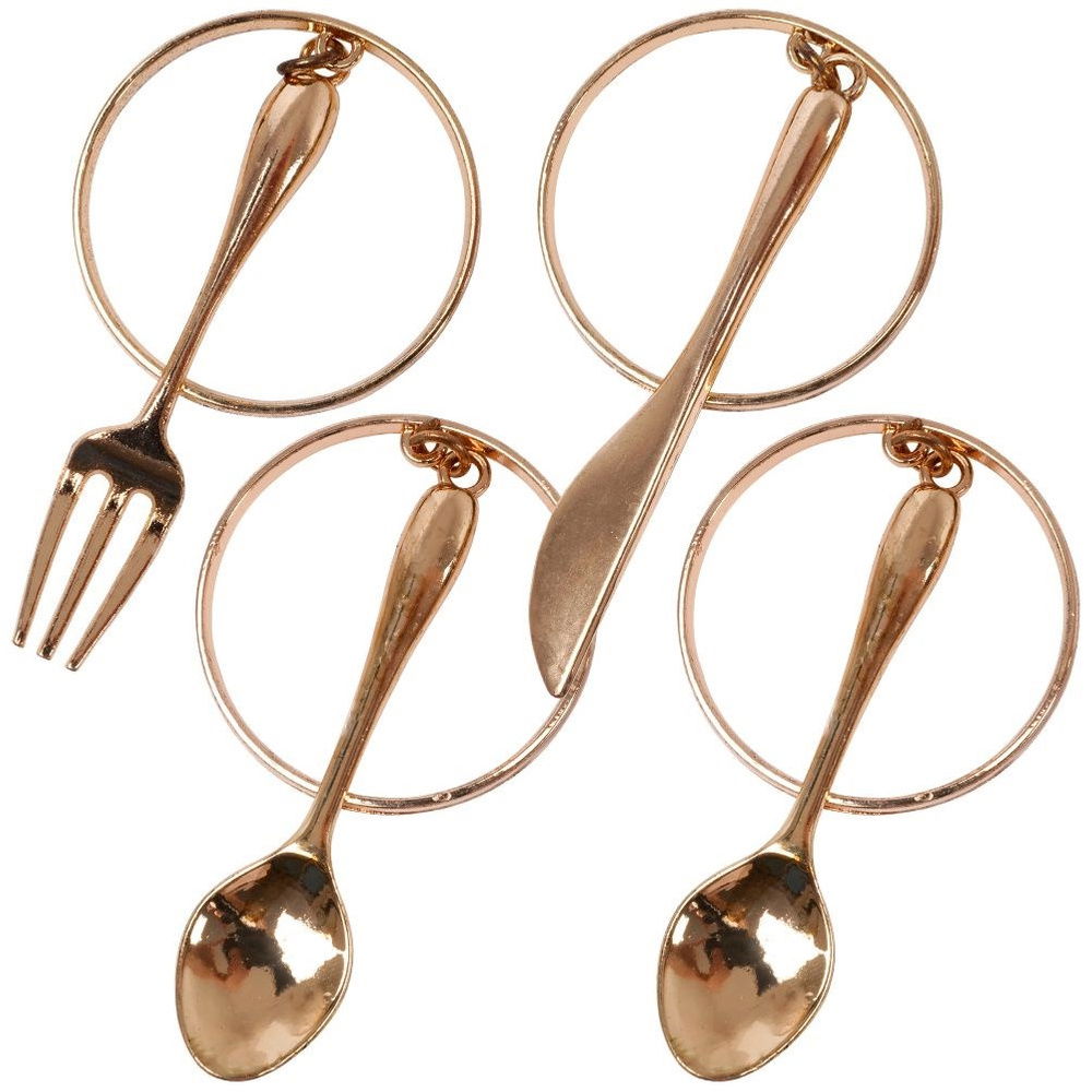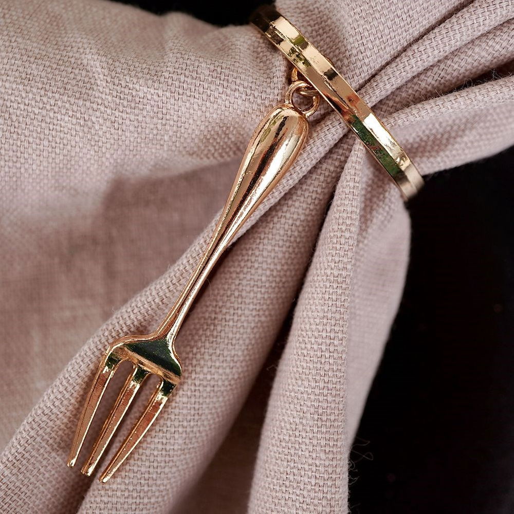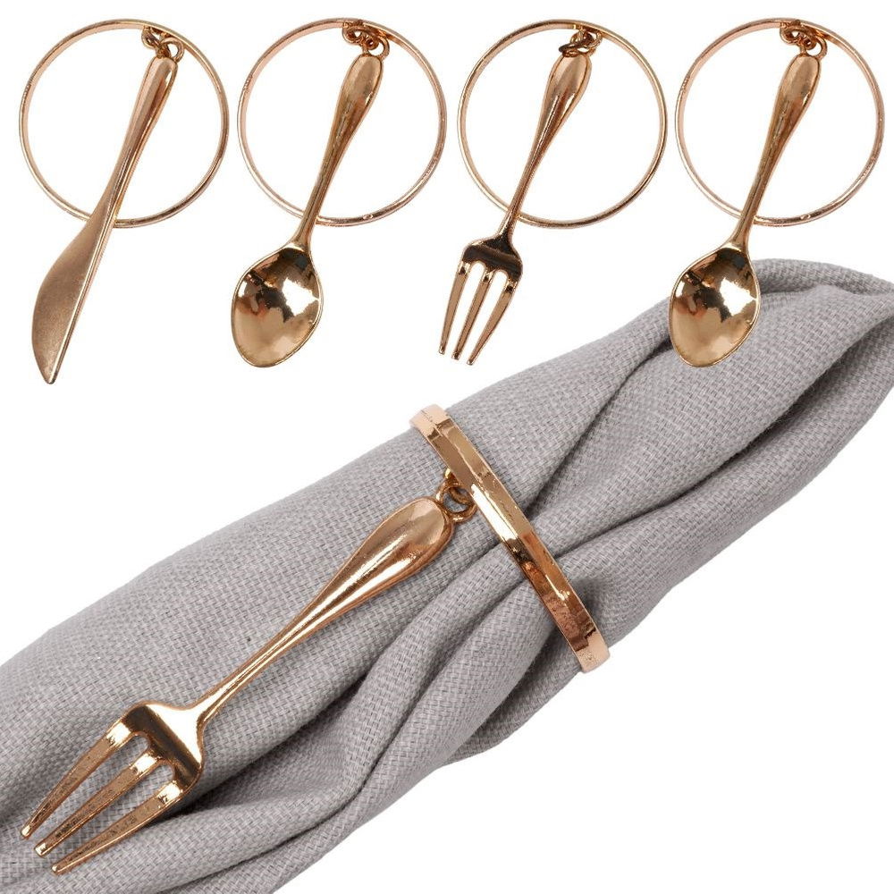 Zestaw czterech pierścieni do serwet. Pierścienie prezentują się bardzo elegancko. Posiadają efektowne sztućce, które dodają im wyjątkowego wyglądu. Dzięki obrączkom na serwetki stół zyska niepowtarzalny wygląd. Pierścienie są bardzo starannie wykonane i możemy używać ich wielokrotnie, podczas wszystkich ważnych uroczystości. Świetny pomysł na prezent np. z okazji parapetówki.