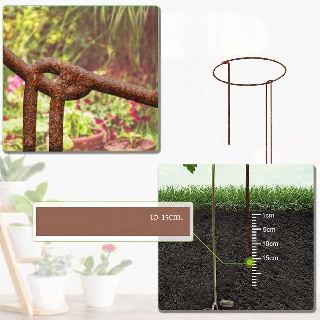 - Materiały premium: w zestawie znajdują się 4 metalowe podpory ogrodowe, które są wykonane z surowej, litej stali i nie są wstępnie zardzewiałe — proces rdzewienia rozpoczyna się dopiero po umieszczeniu ich w ogrodzie. Stalowe obręcze do podtrzymywania roślin naturalnie zmieniają wygląd wraz z upływem czasu, tworząc atrakcyjną, rustykalną patynę, którą można obserwować wraz z rozwojem roślin. Produkt jest w 100% ekologiczny, pozbawiony zielonych plastikowych powłok, które często obniżają estetykę roślin. Dzięki temu kwiaty i rośliny prezentują się znacznie lepiej niż na tradycyjnych, zielonych podporach. Aby uzyskać naturalny efekt zardzewienia, nie stosowano żadnych kwasów ani chemikaliów przyspieszających ten proces, które mogłyby zaszkodzić roślinom i środowisku ogrodu.