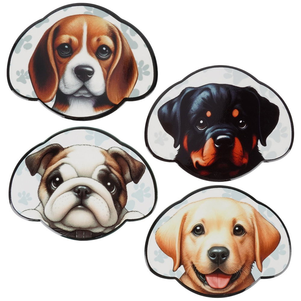 Zestaw 4 podstawek pod kubek w stojaku - Komplet czterech podstawek pod kubek w praktycznym stojaku. Każda podstawka posiada inną grafikę psa. Podstawki mają wymiary 14 x 10,5 x 0,5 cm i umieszczone są w praktycznym metalowym stojaku, który ułatwia ich przechowywanie. Podkładki umieszczone w stojaku mają wymiary 14 x 11 x 3,5 cm.