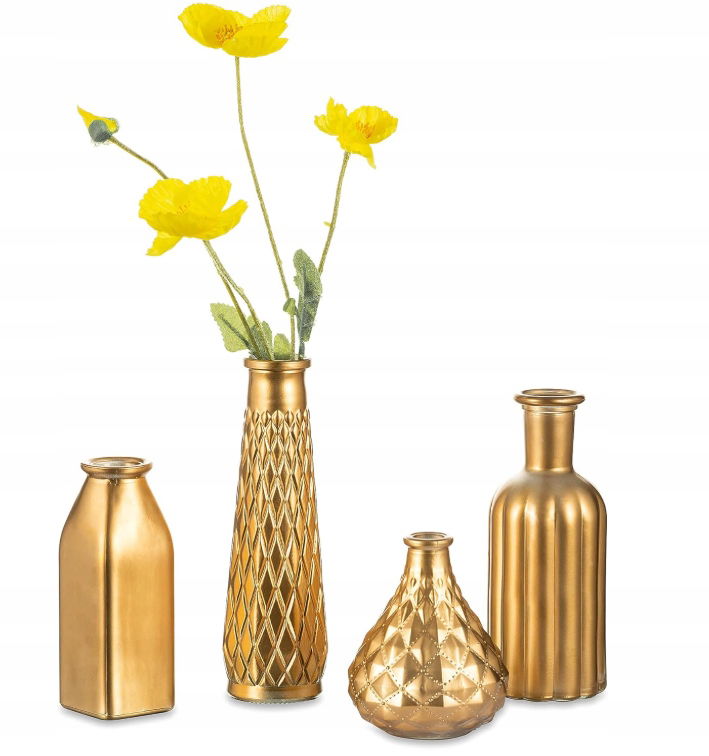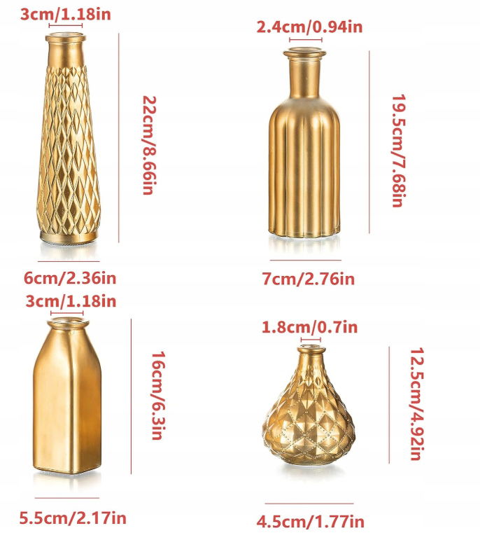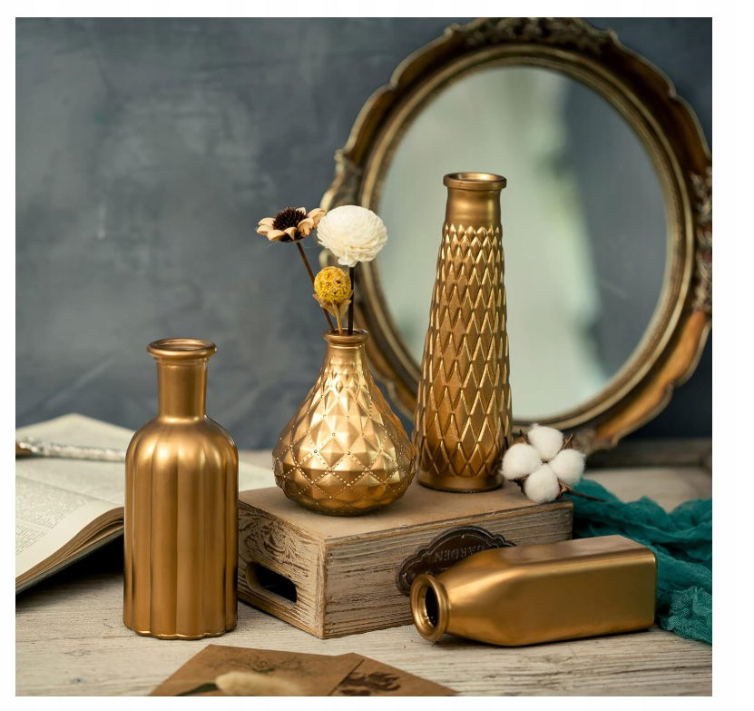 Szukasz detalu, który doda szyku Twojemu wnętrzu lub wyjątkowej uroczystości? Zestaw 4 mini wazonów HEWORY w złotym wykończeniu to połączenie szlachetnej prostoty i elegancji – idealne na wesele, do kawiarni, salonu lub na stół jadalniany.