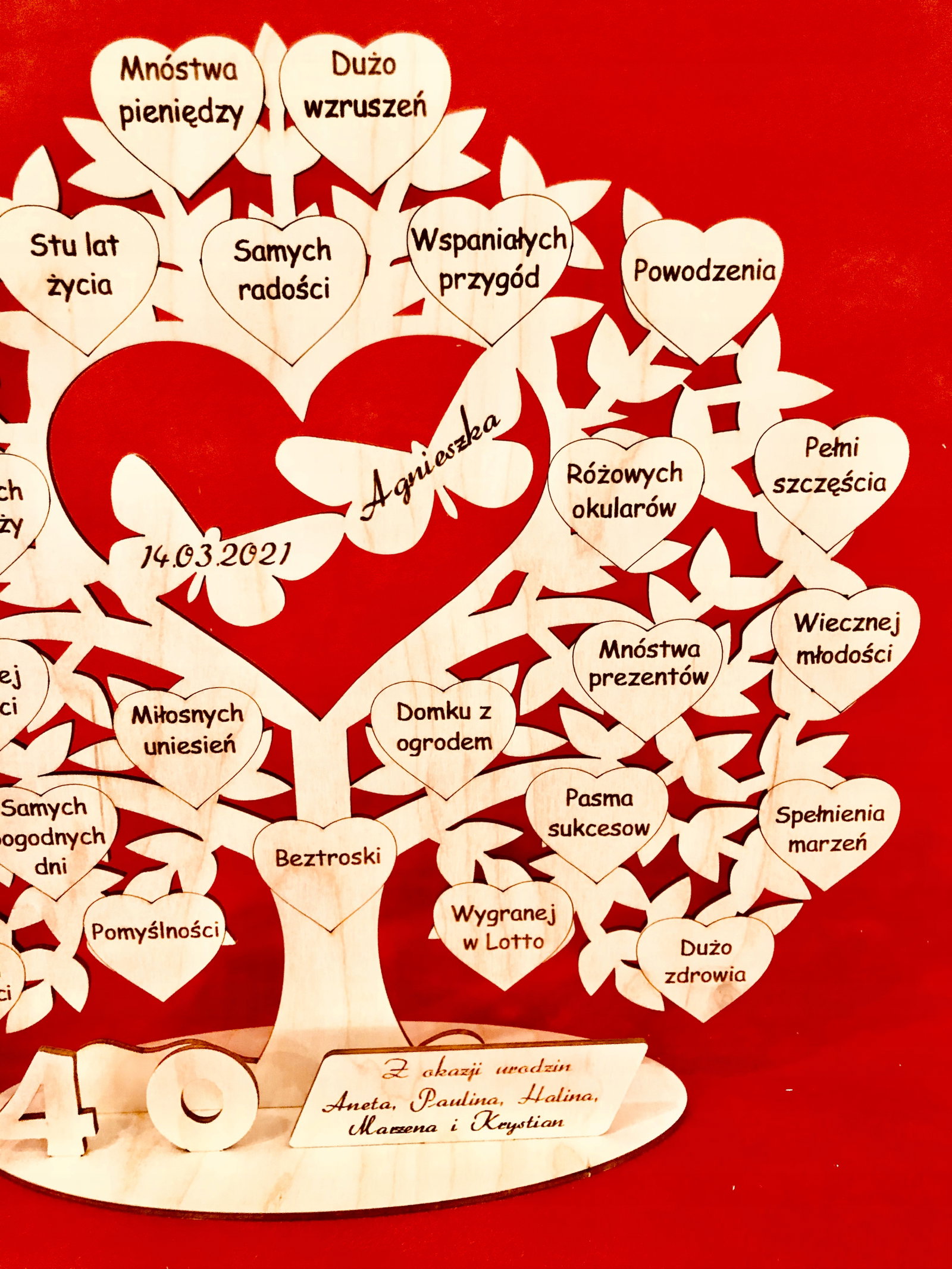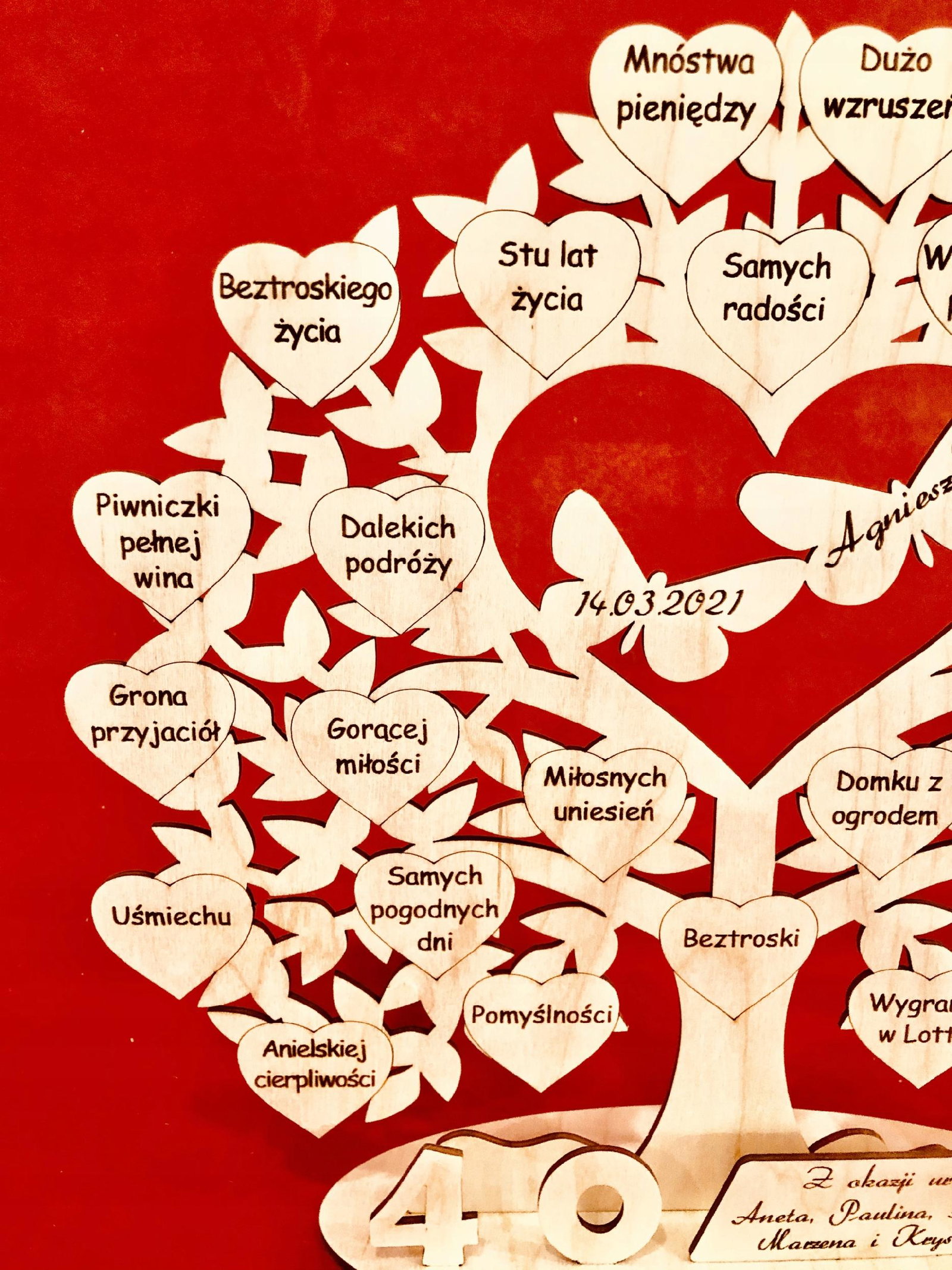 Istnieje możliwość zmiany sentencji wygrawerowanych w serduszkach ( w cenie drzewka zmieniamy do 3 sentencji)