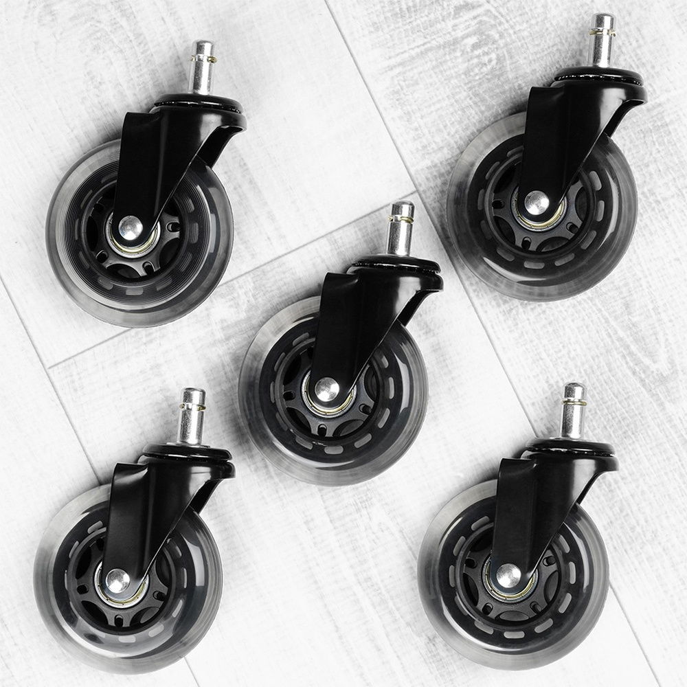 Zestaw pięciu kółek do fotela biurowego. Odpowiedni materiał użyty do ich produkcji zapewni cichą pracę kółek, dzięki czemu korzystanie z fotela będzie bardzo wygodne. Wymiana kółek na kauczukowe pozwoli odpowiednio zadbać o podłogę zarówno w biurze jak i w domu, unikniemy zarysowań i niepotrzebnych zniszczeń.