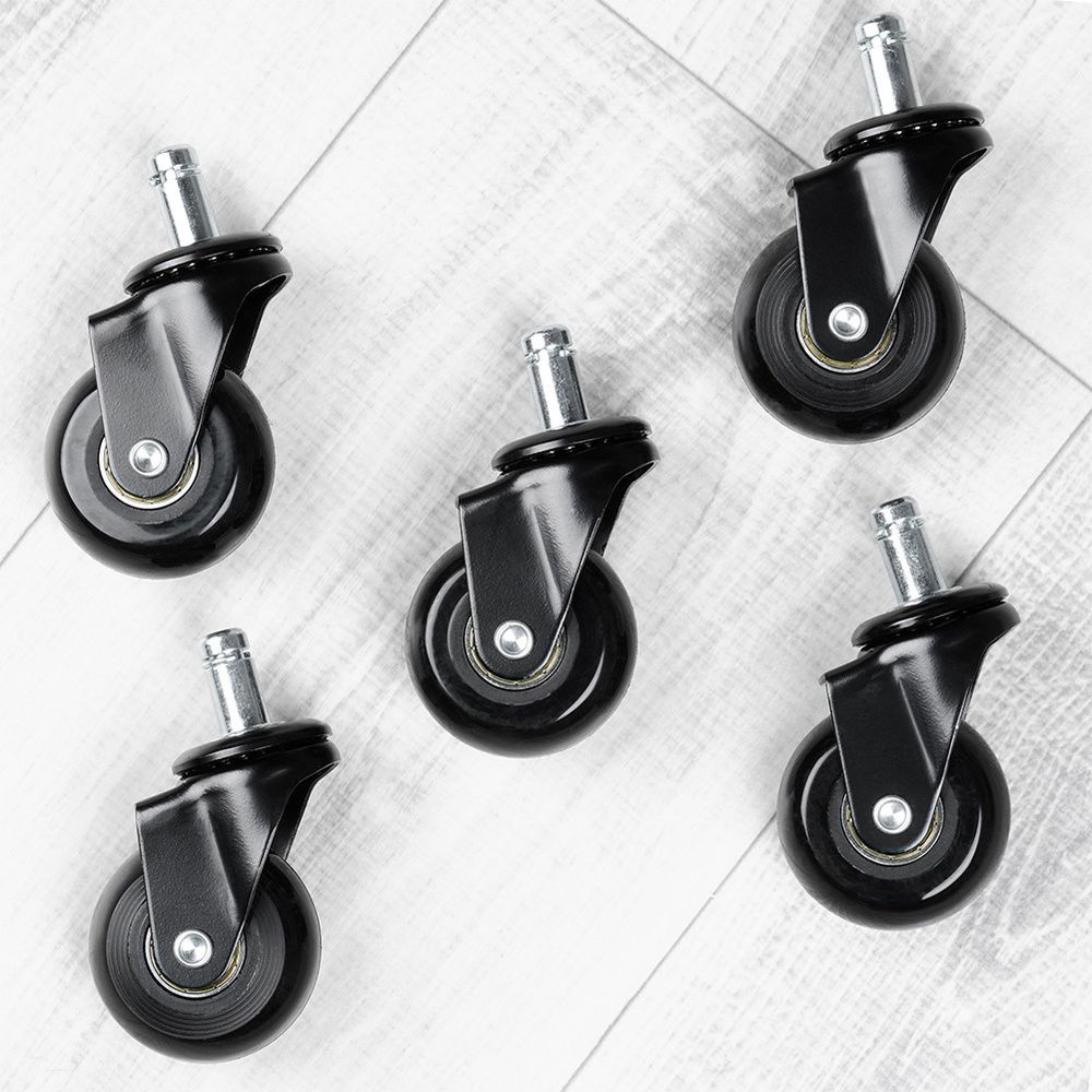 Zestaw 5 szt. wymiennych kółek do fotela - Komplet pięciu zapasowych kółek do fotela biurowego. Średnica każdego kółka wynosi 5 cm. Średnica trzpienia mocującego wynosi 11 mm. Zapewnią ciche i płynne przesuwanie fotela.