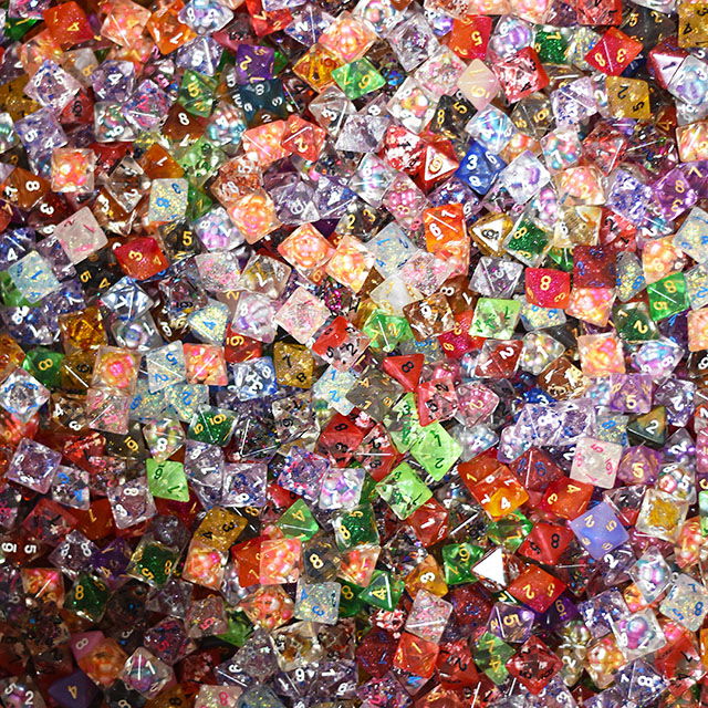 Komplet pięciu tajemniczych, wybranych przez nasze koło fortuny, akrylowych ośmiościennych kości RPG będących podstawą każdej sesji.