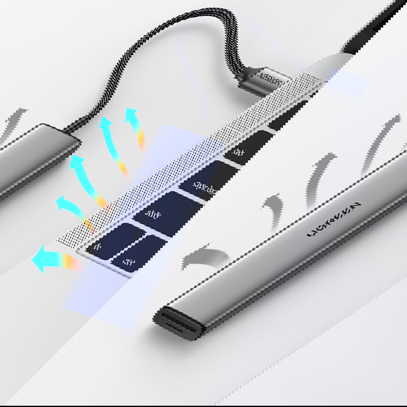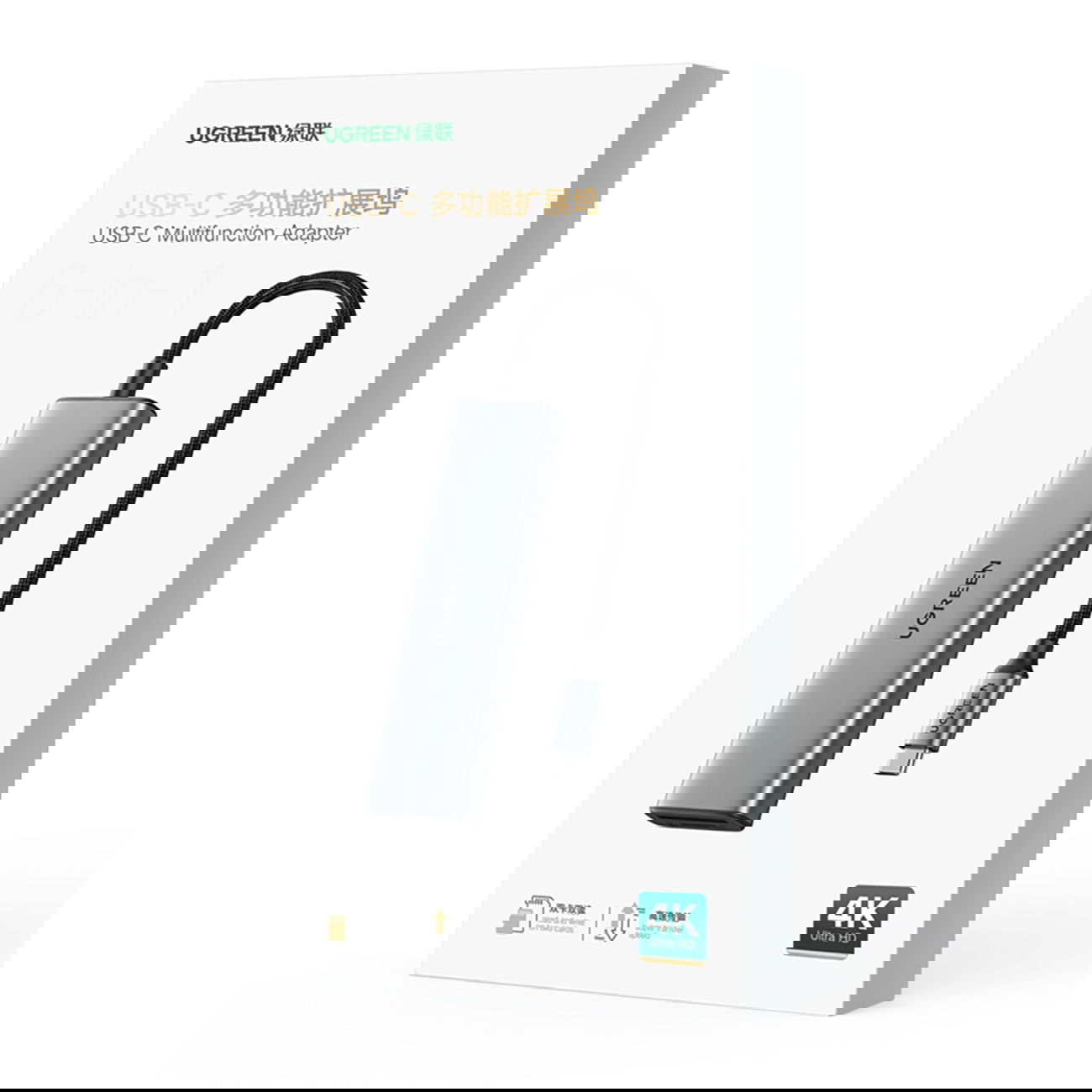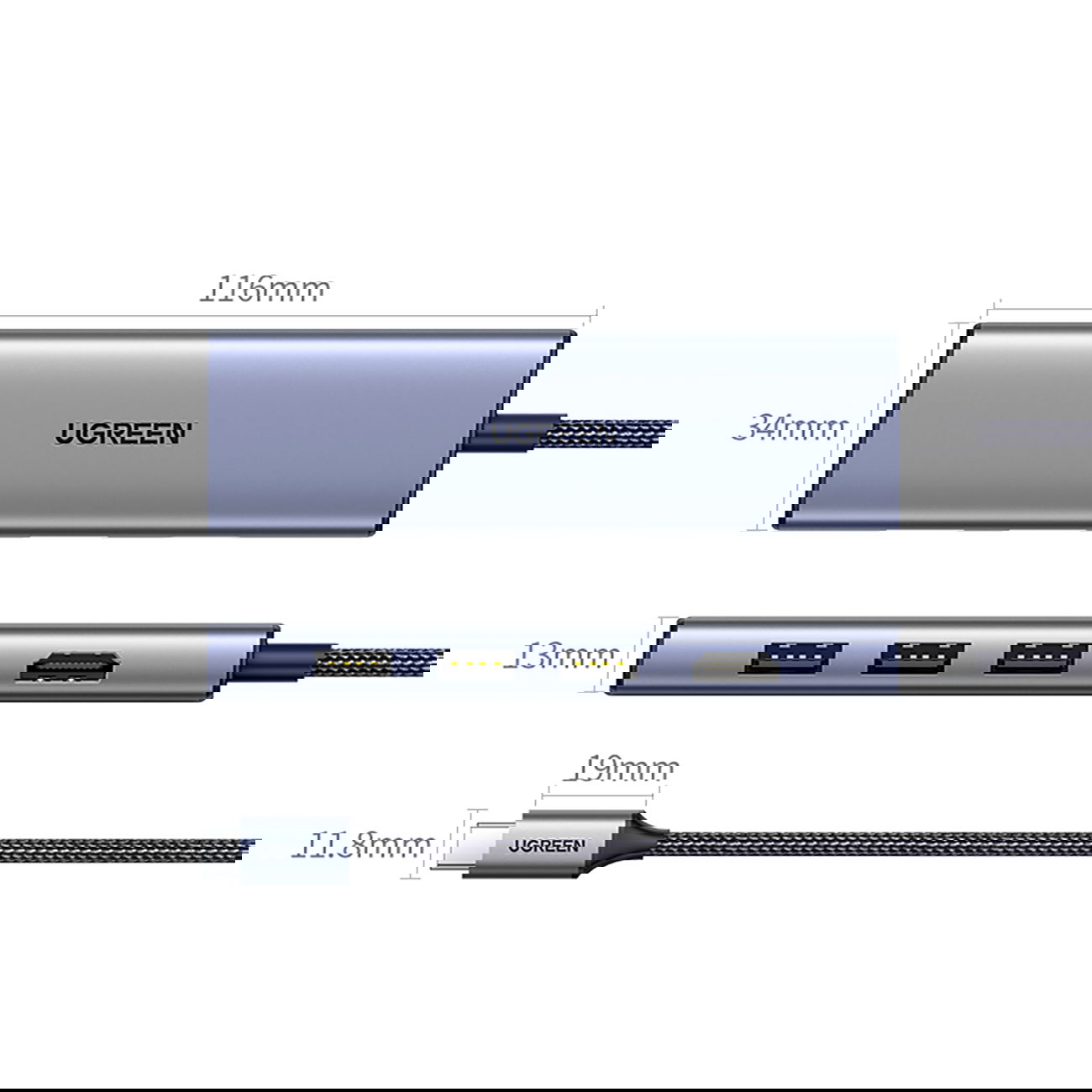 Kod produktu: 1027626Zapomnij o ograniczeniach swojego laptopa dzięki HUB 6w1 Ugreen CM511 20956A. To sprytne urządzenie zamienia jedno złącze USB-C w centrum multimedialne, które obejmuje port HDMI, trzy porty USB-A 3.0 oraz czytnik kart SD/TF. Niezależnie od tego, czy jesteś profesjonalistą potrzebującym wielozadaniowości, czy hobbystą pragnącym prostoty, ten hub sprosta Twoim wymaganiom. Przesyłaj dane z prędkością do 5 Gb/s, ciesz się obrazem w rozdzielczości 4K i korzystaj z kompatybilności z wieloma urządzeniami i systemami operacyjnymi.Zwiększa funkcjonalność Twojego laptopaDzięki HUB 6w1 Ugreen CM511 20956A Twoje urządzenie zyska nowe możliwości. Rozszerzenie jednego złącza USB-C o porty HDMI, 3x USB-A 3.0 oraz czytnik kart SD/TF to idealne rozwiązanie dla osób ceniących sobie wygodę i wielozadaniowość. Niezależnie od tego, czy pracujesz w biurze, czy na wyjeździe, ten HUB zapewni Ci wszystko, czego potrzebujesz do efektywnej pracy.Zapewnia szybki transfer danychTransferuj swoje pliki z prędkością do 5 Gb/s dzięki obsłudze standardu USB 3.0. To znacznie skraca czas przesyłania dużych plików, co jest szczególnie ważne w pracy z multimediami. Wsteczna kompatybilność z USB 2.0/1.1 sprawia, że możesz bez problemu podłączyć starsze urządzenia.Poprawia jakość obrazuHUB Ugreen CM511 20956A umożliwia odtwarzanie obrazu w rozdzielczości 4K 30Hz, co oznacza niesamowitą jakość wizualną. Podłączając go do HDTV, monitora lub projektora, możesz cieszyć się szczegółowym obrazem podczas oglądania filmów lub robić wrażenie profesjonalnymi prezentacjami.Dba o bezpieczeństwo i stylElegancki design aluminiowej obudowy nie tylko dodaje stylu, ale również poprawia odprowadzanie ciepła, co zapewnia bezpieczne użytkowanie. Idealnie komponuje się z nowoczesnymi urządzeniami, zwłaszcza Apple, nadając im jeszcze bardziej profesjonalny wygląd.Gwarantuje szeroką kompatybilnośćHUB Ugreen CM511 20956A działa z większością popularnych marek i systemów operacyjnych, m.in. Windows, MacOS czy Linux. Zapewnia wszechstronność i wygodę w codziennym użytkowaniu.Najważniejsze cechy:
