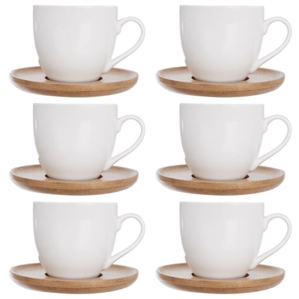 PRZYDATNE - Zestaw sześciu filiżanek z podstawkami bambusowymi w prezentowym opakowaniu. Filiżanki mają maksymalną pojemność 100 ml, średnicę 6,5 cm i wysokość 6 cm. Podstawki mają średnicę 9 cm i wysokość 1 cm.