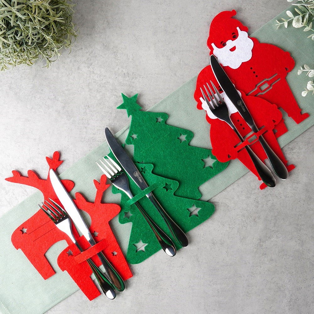 Komplet sześciu etui na sztućce w świątecznym kształcie. W zestawie: 2x etui w kształcie Mikołaja (22 x 13 cm), 2x etui w kształcie choinki (21 x 16,5 cm), 2x etui w kształcie renifera (17,5 x 14 cm). Niezwykle elegancki dodatek do nakrycia stołu. Nadadzą niepowtarzalnego, świątecznego klimatu. Idealny pomysł na świąteczny upominek.