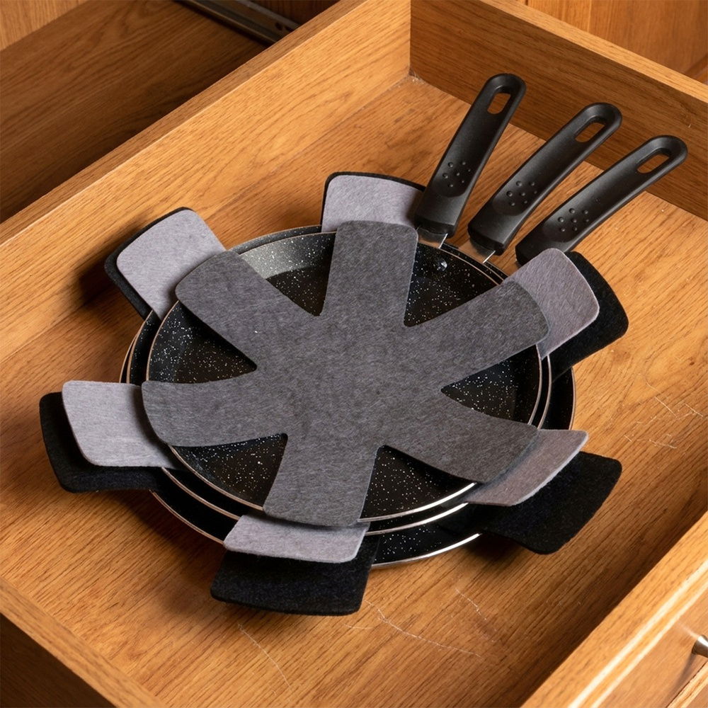 Ochrona i bezpieczne przechowywanie patelni - Idealnie sprawdzają się przy układaniu garnków lub patelni jeden w drugi. Zapobiegają uszkodzeniom, obiciom i ścieraniu powłok, wydłużając żywotność naczyń.