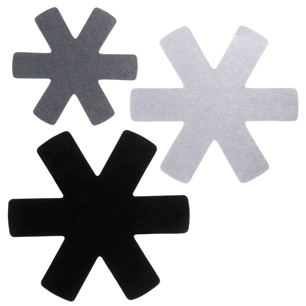 Zestaw 6 szt. przekładek ochronnych - Zestaw 6-ciu przekładek do patelni, garnków, misek i innych naczyń w trzech różnych rozmiarach. W zestawie przekładki: 2x czarne o średnicy 38 cm, 2x jasno szare o średnicy 35 cm i 2x szare o średnicy 26 cm.
