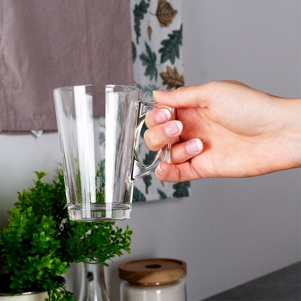 Sześć szklanek z uchwytem o pojemności 255 ml - Zestaw 6 szklanek do napojów o pojemności całkowitej 255 ml. Szklanki posiadają wygodny uchwyt, który zapewni wygodne korzystanie ze szklanki. Wysokość każdej szklanki wynosi 11 cm, a średnica 7,5 cm, długość szklanki z uchwytem to 10,5 cm.