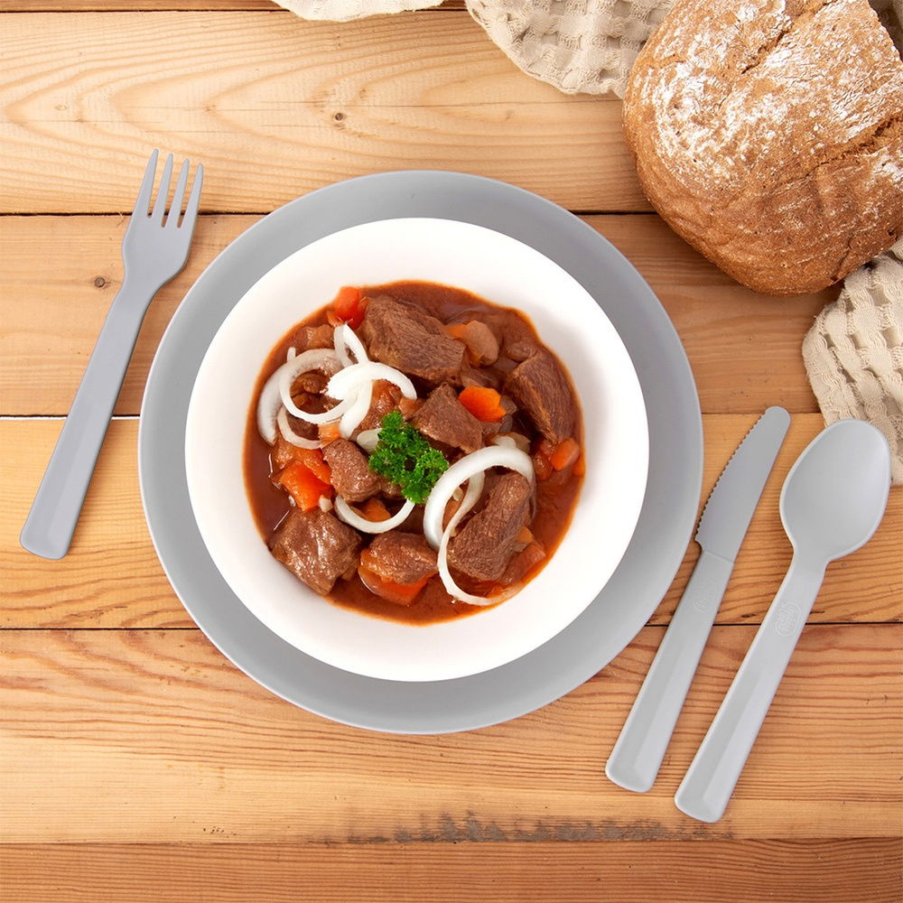Solidne i wytrzymałe - Wykonane z najwyższej jakości tworzywa w szarym kolorze. Odporne na uszkodzenia, pęknięcia i zarysowania, stanowią doskonałą alternatywę dla tradycyjnych sztućców metalowych.