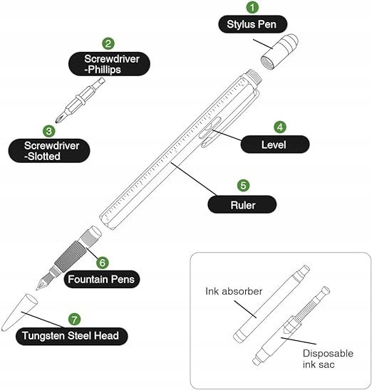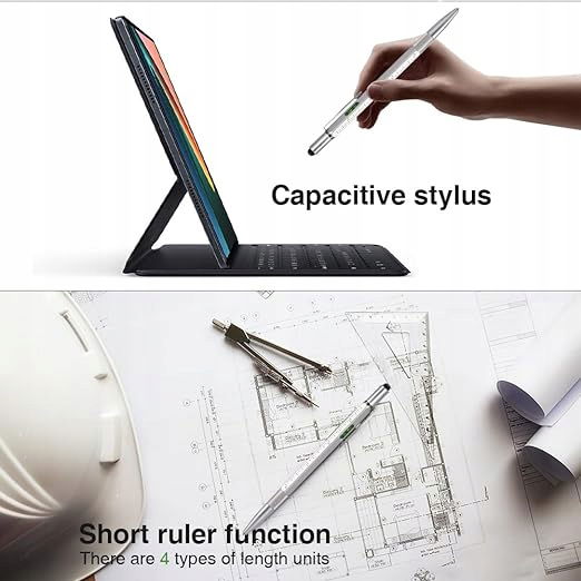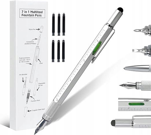 Wielofunkcyjne pióro wieczne z następującymi praktycznymi funkcjami: pióro wieczne, linijka, śrubokręty (płaska główka i głowica krzyżakowa), rysiki do ekranów dotykowych, poziomica. To wielofunkcyjne pióro 7 w 1 spełni wszystkie Twoje potrzeby w pracy!