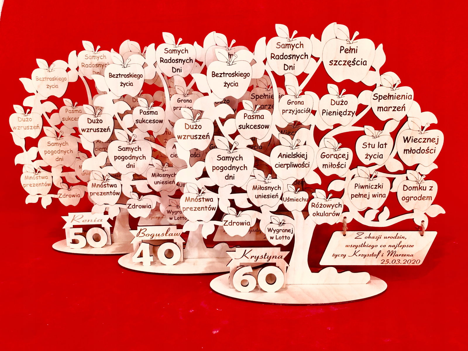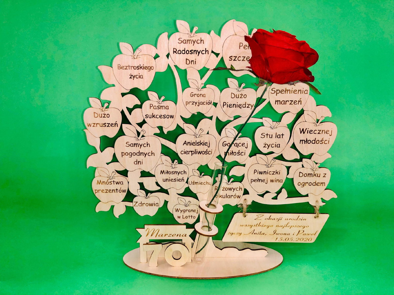 Przepięknie wycięte ze sklejki i grawerowane drzewko z życzeniami dla solenizanta.