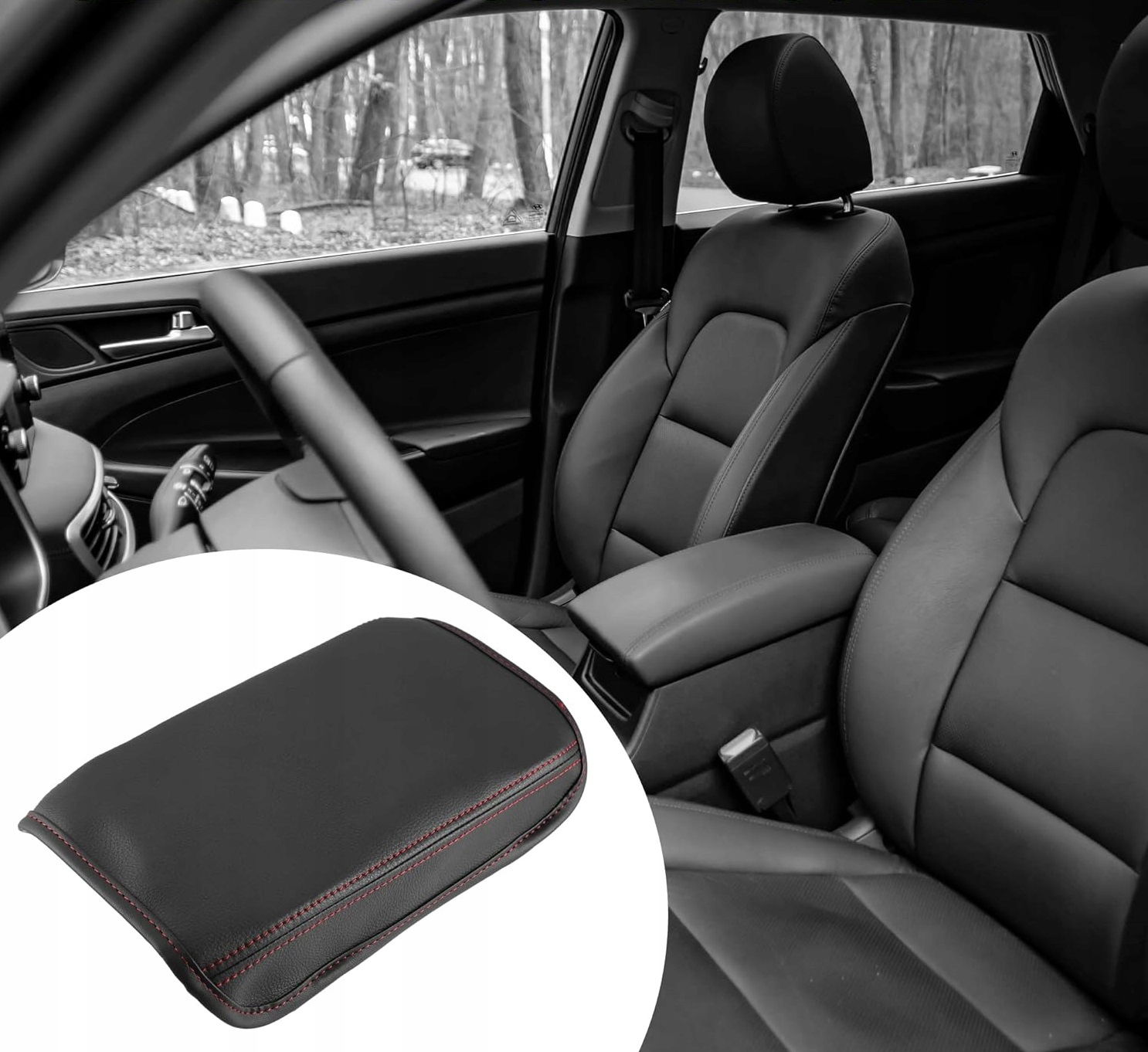 ABSOPRO Pokrowiec na Konsolę Środkową Samochodu Hyundai Tucson NX4 – Czerwone Szwy, Czarna Sztuczna Skóra, Idealne Dopasowanie! ?️