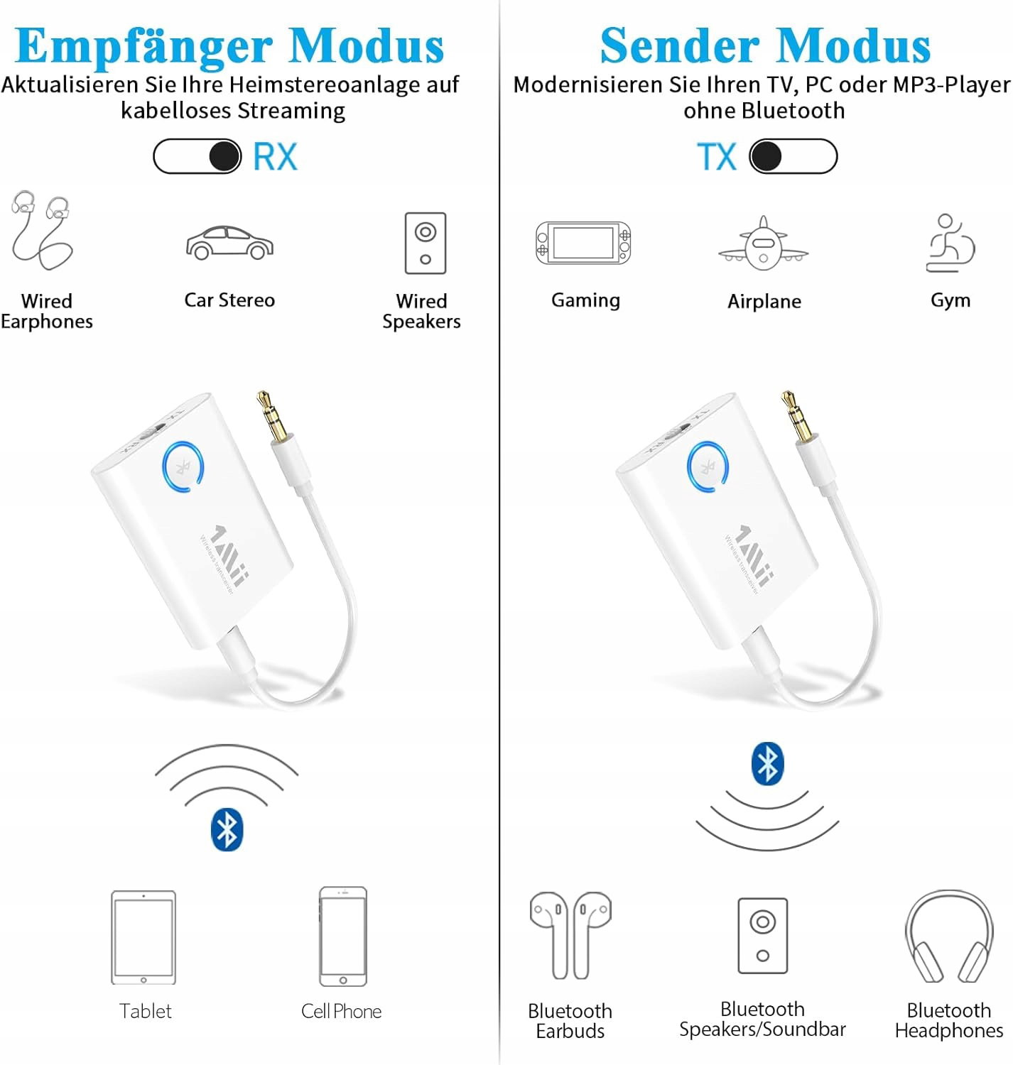 ✅ Dodatkowe funkcje: 2 w 1 nadajnik Bluetooth 5.3 odbiornik, bluetooth samolot adapter słuchawki, Podróże, nadajnik audio bluetooth, aptX-Adaptive/aptX HD/aptX Low Latency, transmiter bluetooth tv, Bezprzewodowy