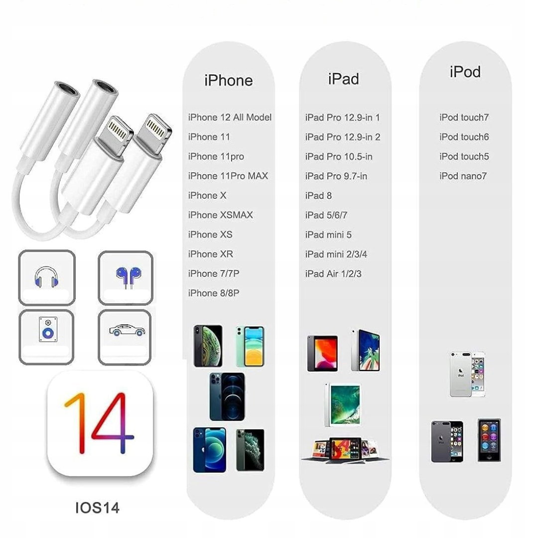 - Uniwersalna kompatybilność: adapter Lightning na gniazdo słuchawkowe 3,5 mm jest kompatybilny z urządzeniami iPhone 14/14 Plus/14 Pro/14 Pro Max/13/13 Mini/13 Pro/13 Pro Max/12/12 Mini/12 Pro/12 Pro Max/SE 2020/11/11 Pro/XS/XR/X/8/8 Plus/7/7 Plus, a także z iPadami i iPodami. Obsługuje system iOS 15 i wcześniejsze wersje, umożliwiając odtwarzanie muzyki za pomocą słuchawek 3,5 mm lub kabla AUX, na przykład w samochodzie.