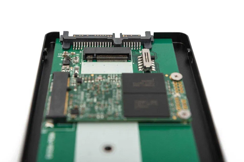 Prędkość odczytu do 520 MB/s SATA Rev.3.2 z trybem oszczędzania energii DEVSLP Ustawianie trybu przełącznikiem DIP Zamknięta obudowa aluminiowa Wymiary: 100 x 70 x 7mm