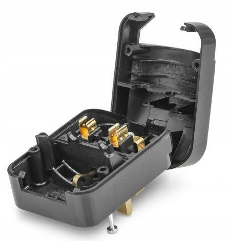 Wtyczka ma pokrywę na zawiasach i jest zabezpieczona śrubą i zewnętrznym dostępem bezpiecznika.