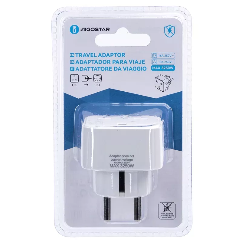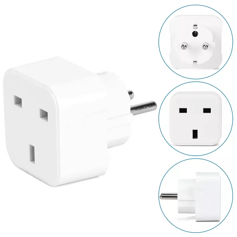 Pojedynczy adapter do Angielskich wtyczek dla podróżnych odwiedzających Niemcy i inne kraje europejskie. Adapter z uziemieniem.