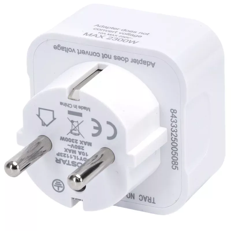 Przejściówka przeznaczona dla urządzeń z chińską wtyczką do gniazdek typu - niemieckiego popularnych również w Polsce. Adapter odpowiedni dla 2-polowych i 3-polowych (uziemionych) wtyczek (klasy I i II). Napięcie urządzenia, które ma być połączone musi odpowiadać napięciu w lokalnej sieci energetycznej. Parametry techniczne: