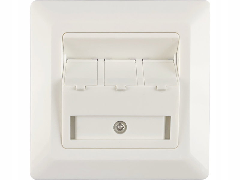 Ramka montażowa przeznaczona do montażu trzech modułów KEYSTONE (RJ11, RJ12, RJ45) w puszkach instalatorskich 60mm, listwach instalacyjnych podtynkowych i natynkowych. Moduły mocowane są pod kątem 45°. Korpus ramki wykonany jest z metalu z konektorem uziemienia, a klapki przeciwkurzowe chronią złącza. Wyposażona w pole opisowe z plastiku