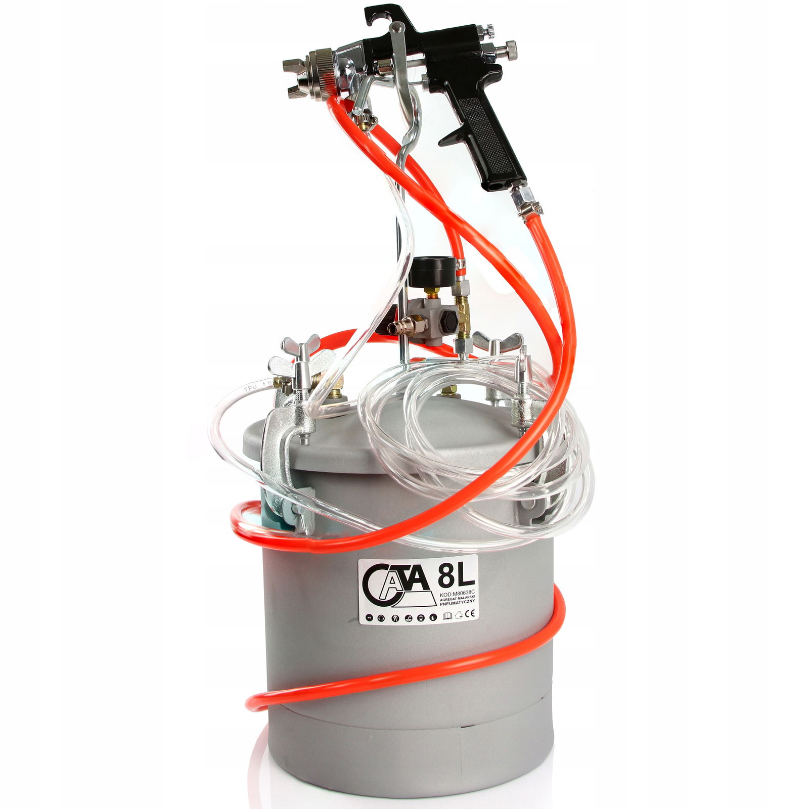 Zestaw posiada 8 l zbiornik, na pokrywie którego mocowany jest reduktor ciśnienia, z manometrem i zaworem bezpieczeństwa. Do pistoletu lakierniczego farba podawana jest pod ciśnieniem i tam rozpylana jest przy pomocy sprężonego powietrza. Ciśnieniowy agregat malarski idealnie sprawdzi się przy malowaniu dużych powierzchni i nie tylko.