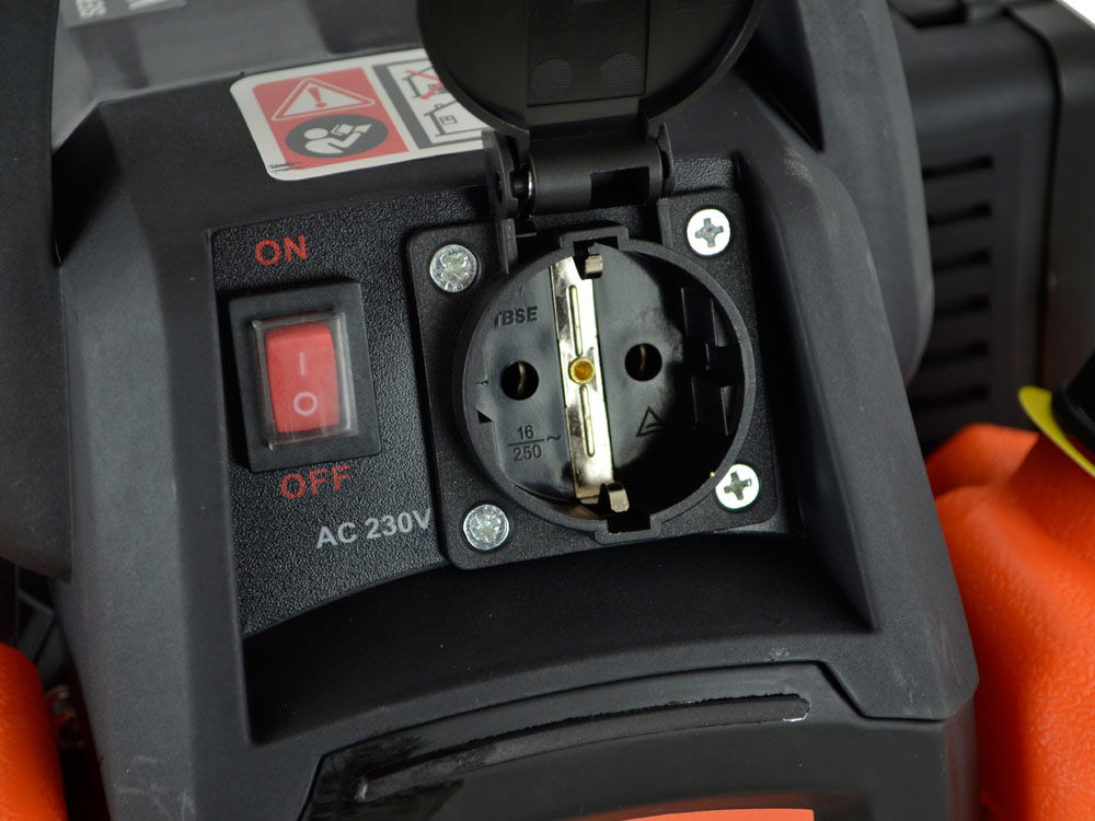 Agregat zasilany jest dwusuwowym silnikiem spalinowym o pojemności 42,7 cc. Posiada czytelną tablicę rozdzielczą na której zamontowane zostały gniazdo do zasilania napięciem 230 V. Zabezpieczony został przed uszkodzeniem zabezpieczeniem przeciążeniowym.