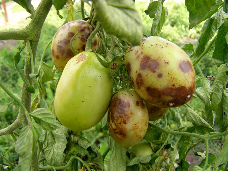 Objawy: Zaraza ziemniaka jest to najgroźniejsza choroba pomidorów. Szczególne intensywnie choroba występuje w lata chłodne i wilgotne. Najczęściej pierwsze objawy można zaobserwować w lipcu i sierpniu, choć przy sprzyjających warunkach może wystąpić również w czerwcu. Na liściach i łodygach pomidora pojawiają się nieregularne, brązowe, stopniowo powiększające się plamy. Na spodzie liści, w miejscach plam, w warunkach wysokiej wilgotności powietrza, widoczny jest biały nalot zarodników grzyba. Porażone liście zamierają. Jednak głównie objawy występują na owocach pomidora. Na owocach pojawiają się brunatne plamy, ulegające twardej zgniliźnie. Zgnilizna sięga w głąb miąższu, a nawet do komór nasiennych. Nawet po odkrojeniu miejsc zmienionych chorobowo owoce pomidorów nie są zdatne do spożycia, ponieważ są gorzkie. W momencie wysokiej wilgotności powietrza na pograniczu zdrowej i chorej tkanki może pojawić się biały nalot, który znika gdy wilgotność spada. Silne porażenie prowadzi do zamierania całych roślin, dlatego należy bardzo szybko reagować stosując zabiegi ochrony roślin.
