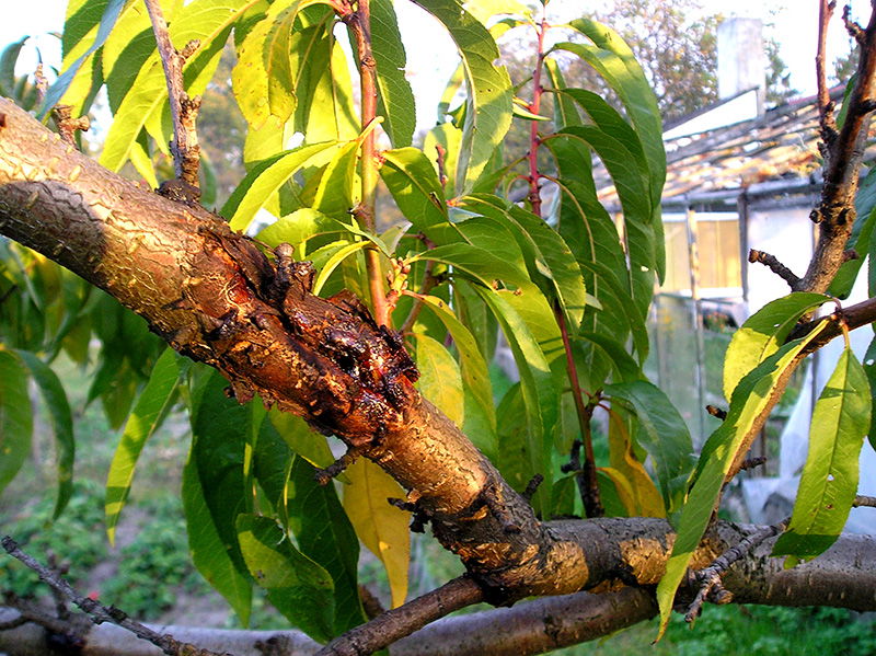 Objawy: Objawy choroby występują na wszystkich nadziemnych częściach roślin. Pierwsze objawy choroby obserwuje się na kwiatach, które wskutek infekcji brunatnieją i zasychają. Z porażonych kwiatów infekcja postępuje dalej do pędów. Wyraźnie widocznym skutkiem porażenia pędów są wycieki „gumy”. Na porażonych owocach pojawiają się brunatne plamy gnilne. Na liściach początkowo objawy widoczne są pod postacią uwodnionych plam. Następnie tkanka w obrębie plam zamiera i wykrusza się, przez co powstają drobne dziurki. Jesienią bakterie bardzo łatwo wnikają przez liścioślady (blizny po liściach), w tym miejscu bakterie zimują. Wiosną bakterie te powodują zamieranie pąków. Na korze w miejscu infekcji powstają spękania, a kora wokół miejsca porażenia zamiera. Z ran sączą się wycieki gumowe. Zamieranie kory może obejmować nawet cały obwód pnia. Porażone drzewa słabiej plonują, a przy porażeniu pnia mogą całkowicie zamierać.