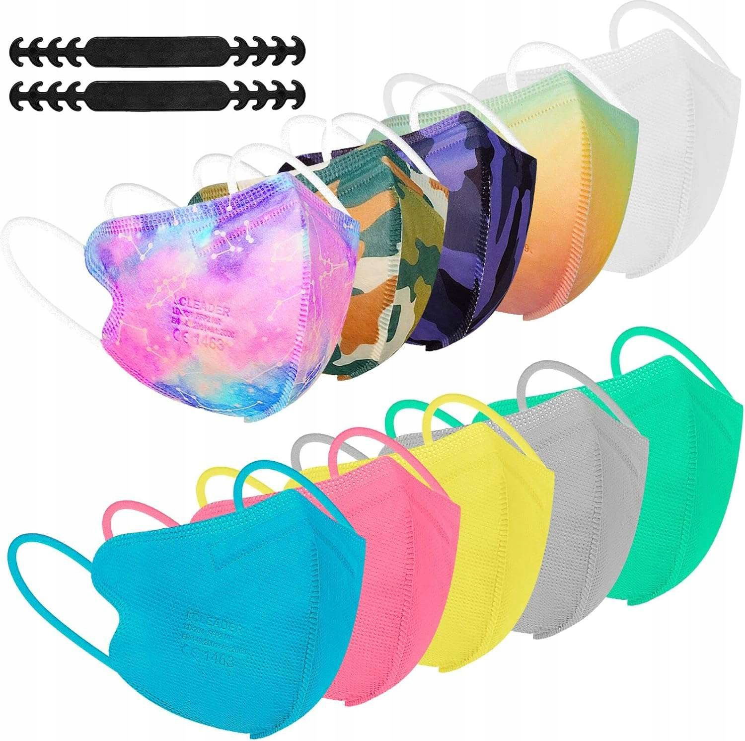 Kolorowa maska FFP2 - kolorowa maska doda Twojemu życiu trochę radości. Możesz wybrać maskę w zależności od nastroju lub ubrania. 10 kolorów: szary, różowy, niebieski, biały, zielony, żółty, tęczowy, wzór maskujący, gwiaździste niebo