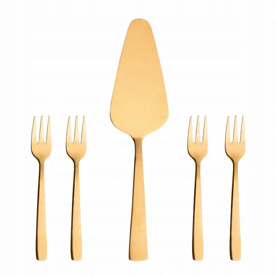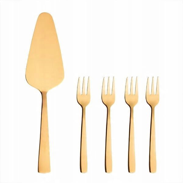 Ilość: 5 elementów (1 serwer do tortów: długość 22,5 cm, szerokość 5 cm oraz 4 widelce do tortów: długość 14 cm, szerokość 1,9 cm)
