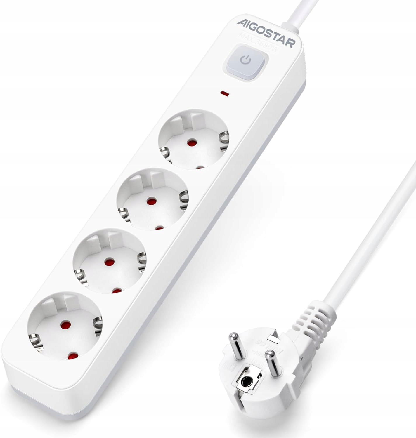 Aigostar listwa zasilająca 4 wtyczki przedłużacz z przełącznikiem 3m biały