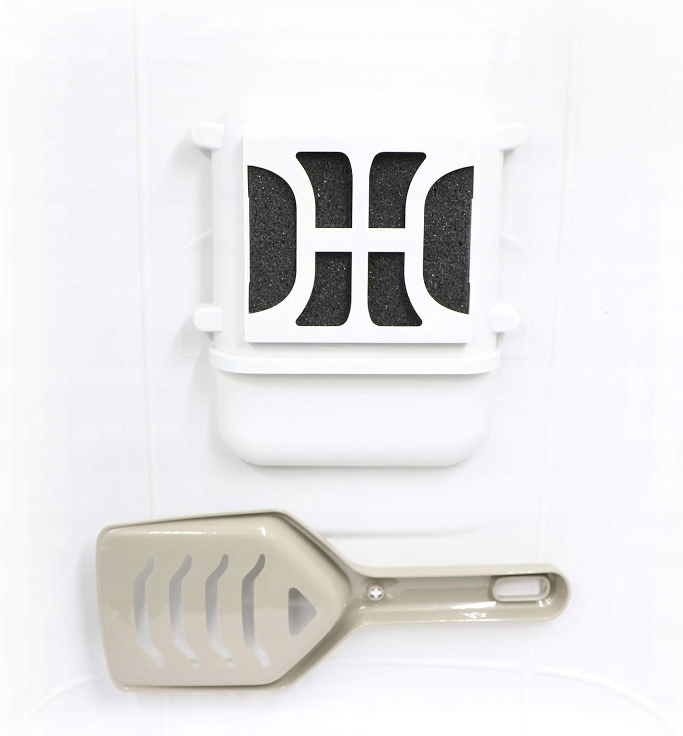Wyposażony w składane drzwiczki, filtr węglowy do kontroli zapachów, zagłębiony uchwyt do transportu i łopatę.