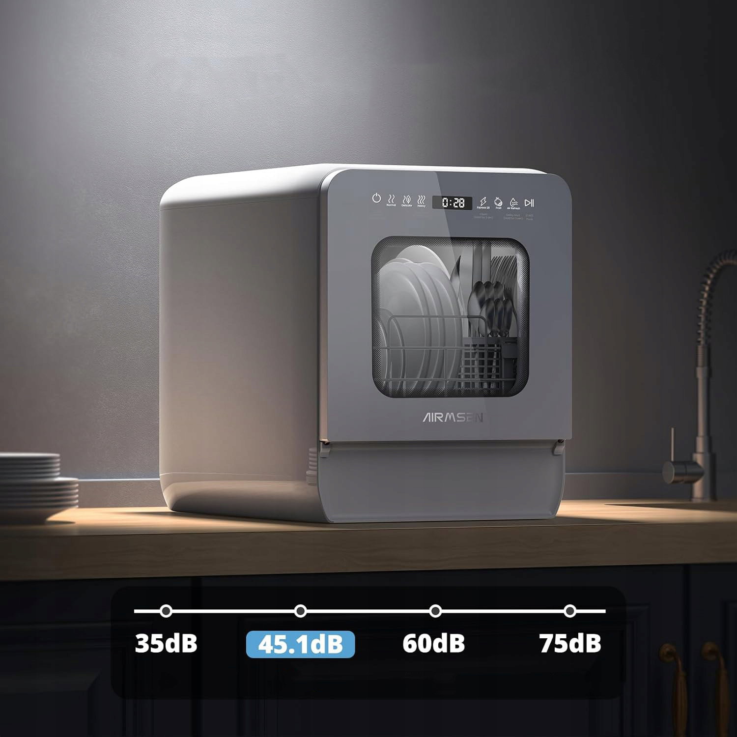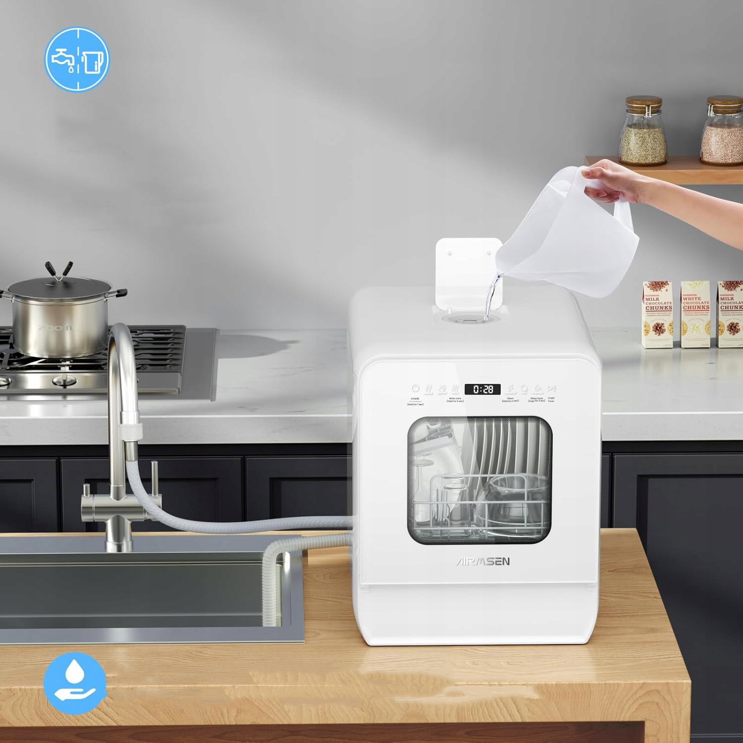 AIRMSEN 2025 to ulepszona, przenośna zmywarka stołowa z wbudowanym zbiornikiem 5 l, która nie wymaga stałego podłączenia do instalacji wodnej. Dzięki kompaktowej konstrukcji doskonale sprawdzi się w małych kuchniach, kawalerkach, biurach czy domkach letniskowych.