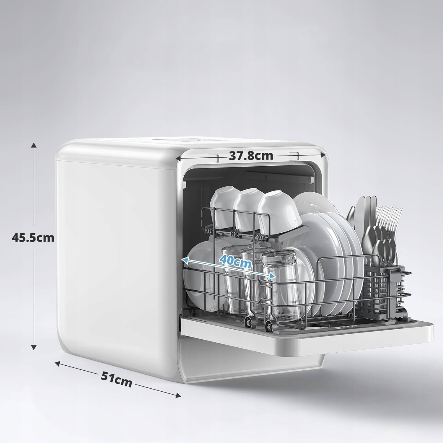 Szerokość zaledwie 37,8 cm pozwala zaoszczędzić do 20% miejsca w porównaniu do klasycznych modeli 45 cm. Głębokość 51 cm zapewnia zoptymalizowaną przestrzeń wewnętrzną mieszczącą do 4 kompletów naczyń – idealne rozwiązanie dla 3–4 osób.